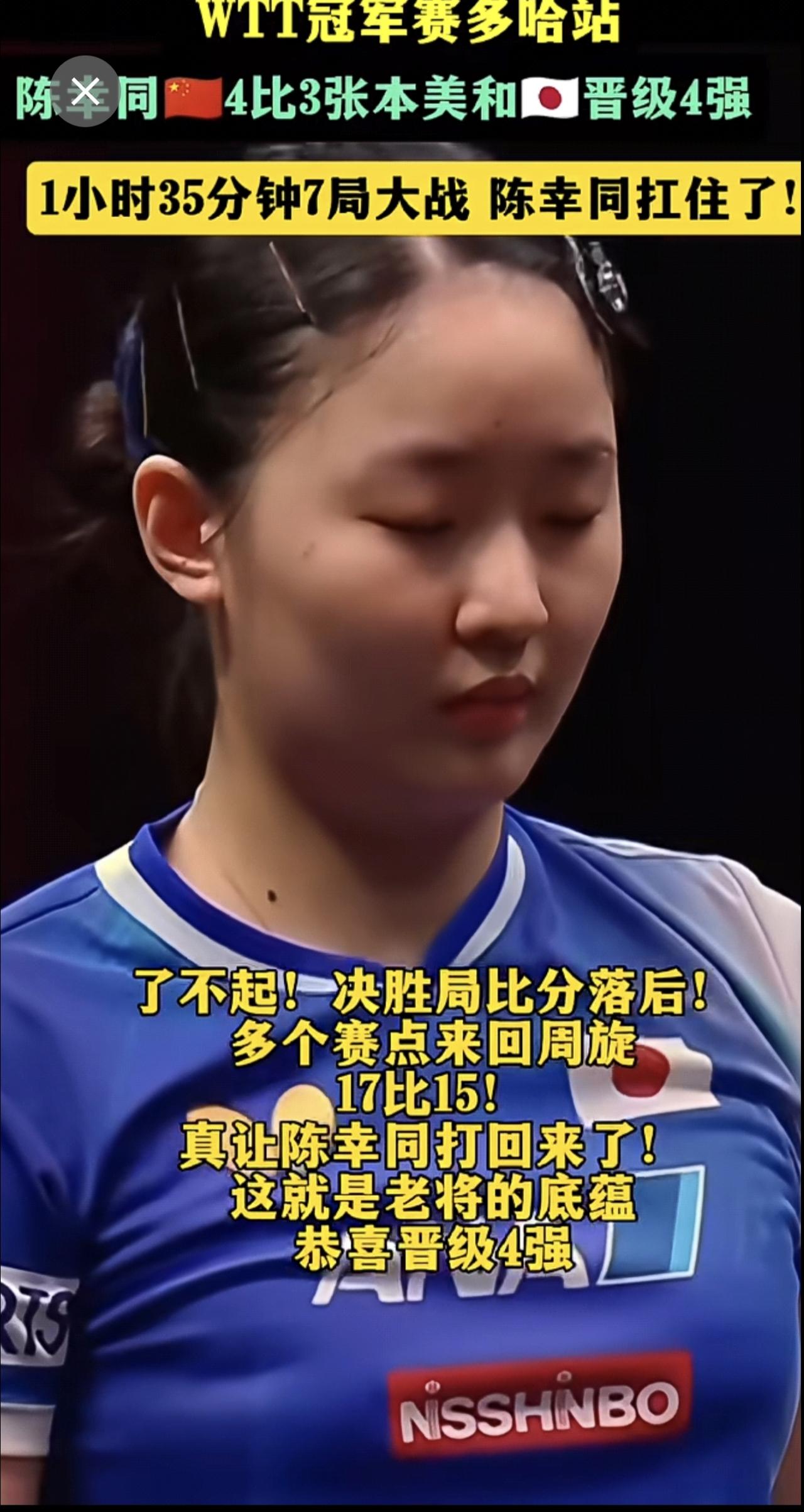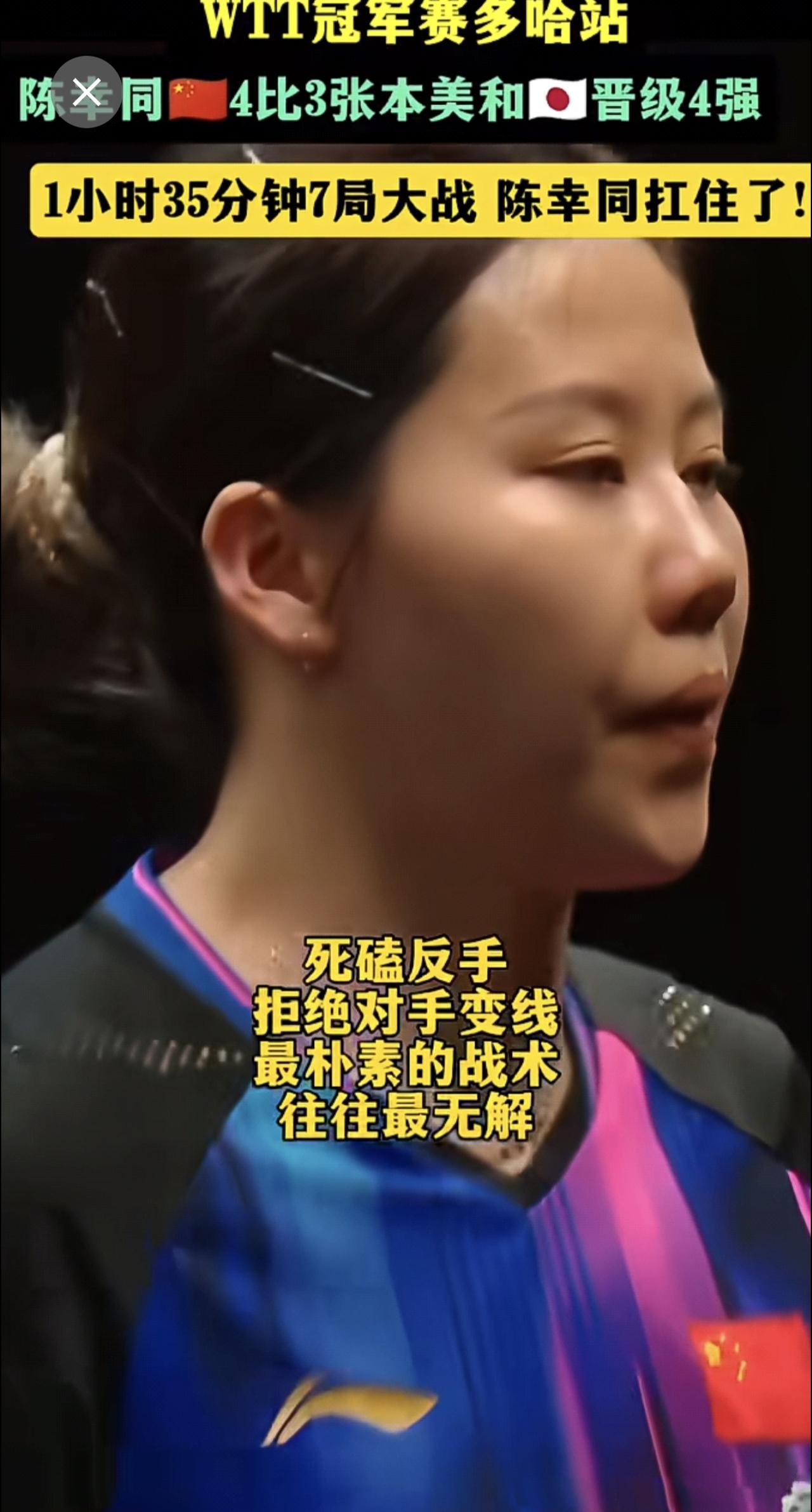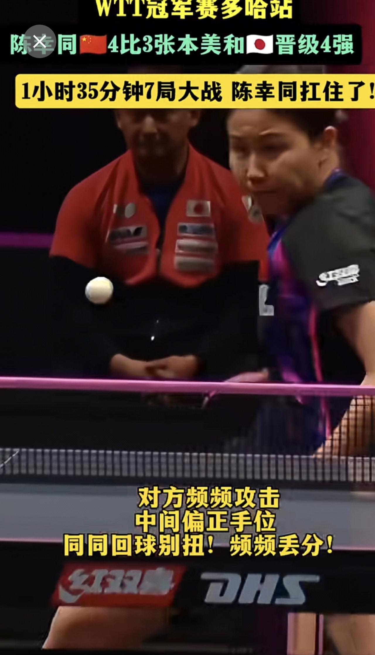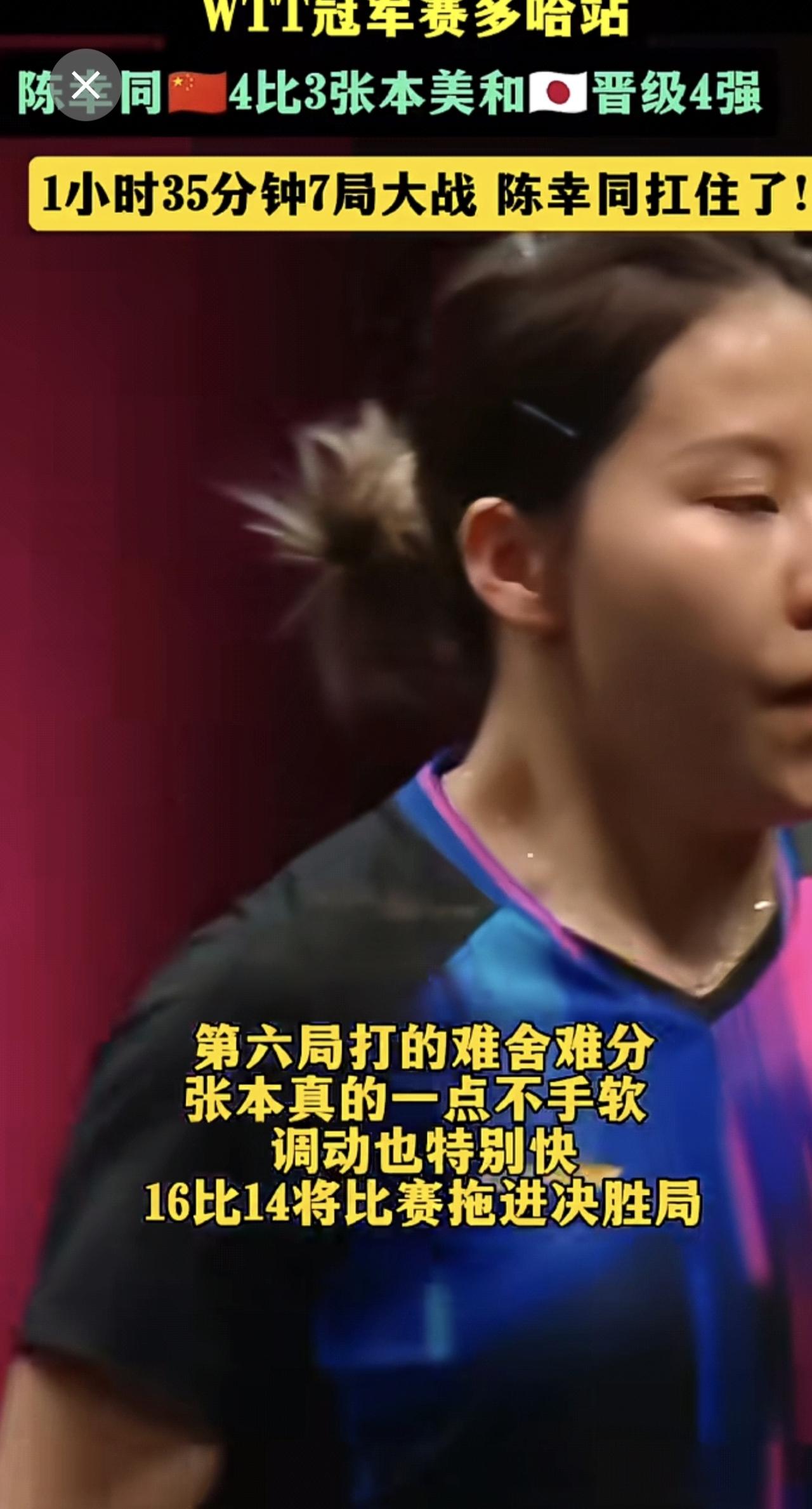 WTT冠军赛多哈站陈幸同🇨🇳4比3战胜张本美和🇯🇵晋级4强,1小时35分