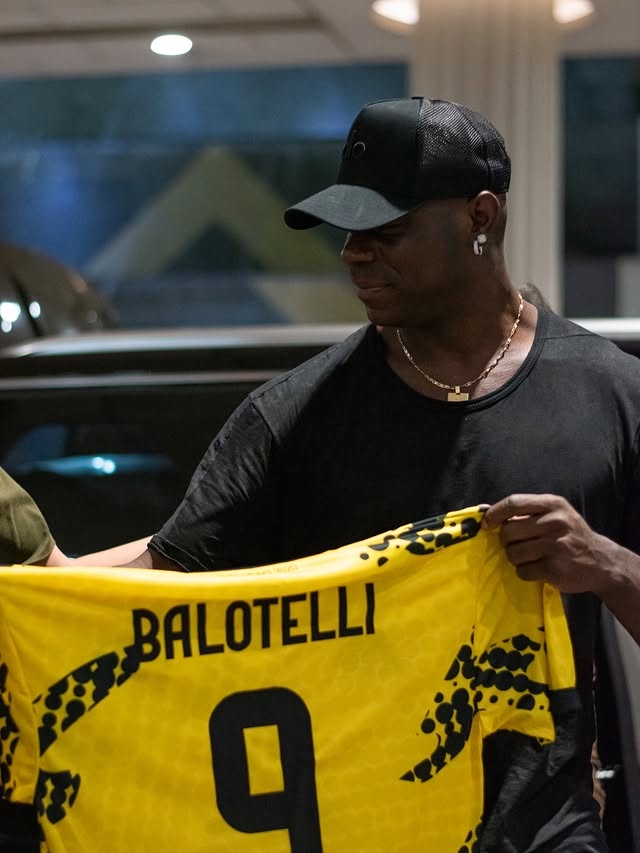 伊蒂法克官方晒照,巴洛特利手持有自己印号的伊蒂法克9号球衣,伊蒂法克官方表示:“巴洛特利已经抵达,将在看台观看我们明天的比赛。”