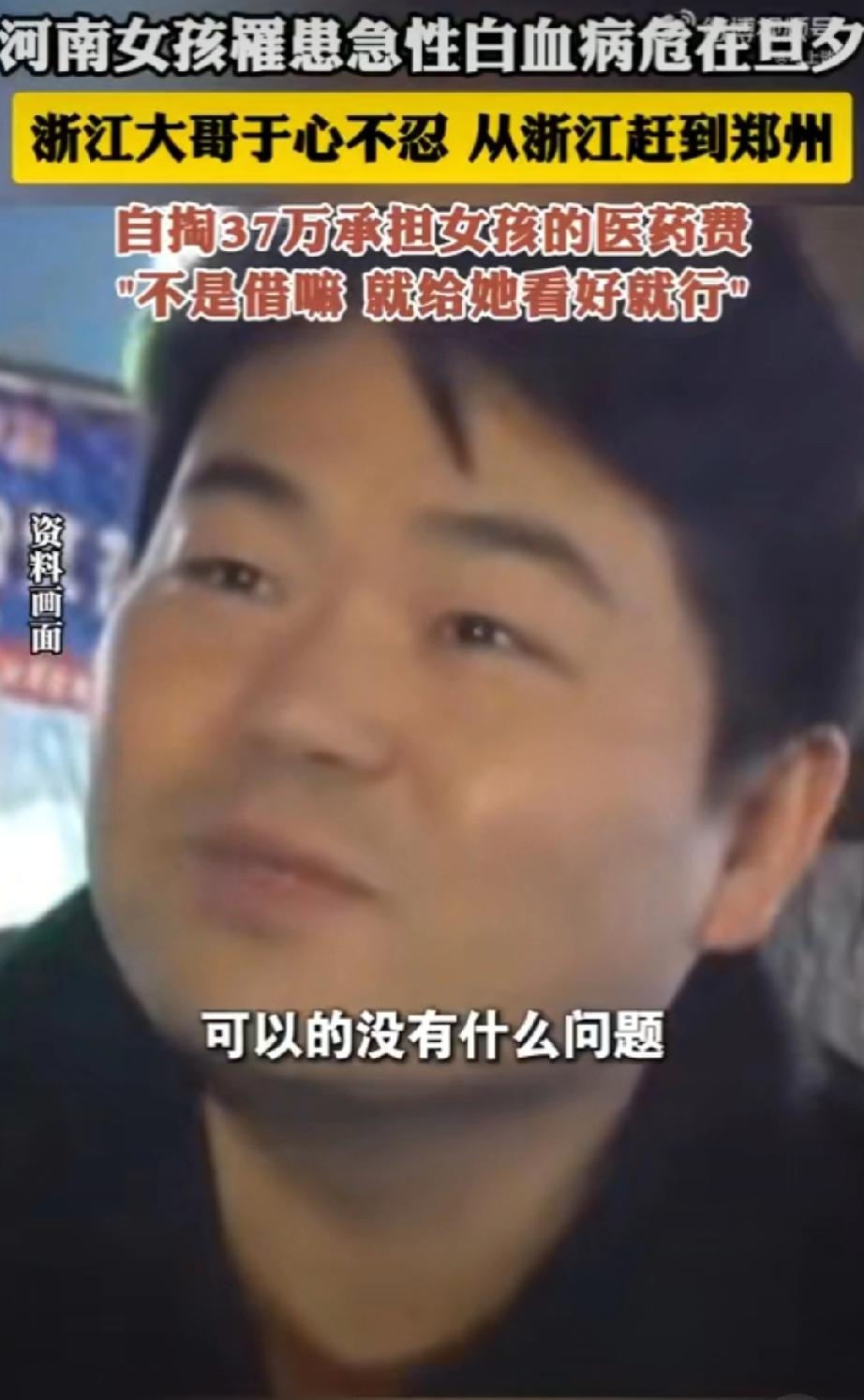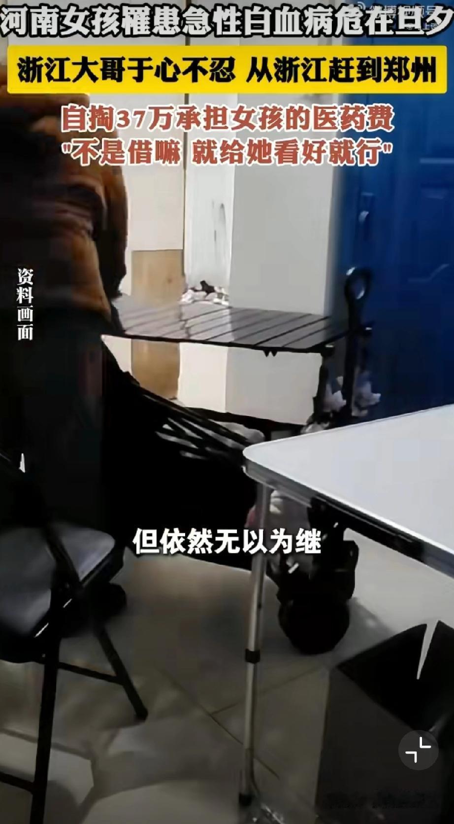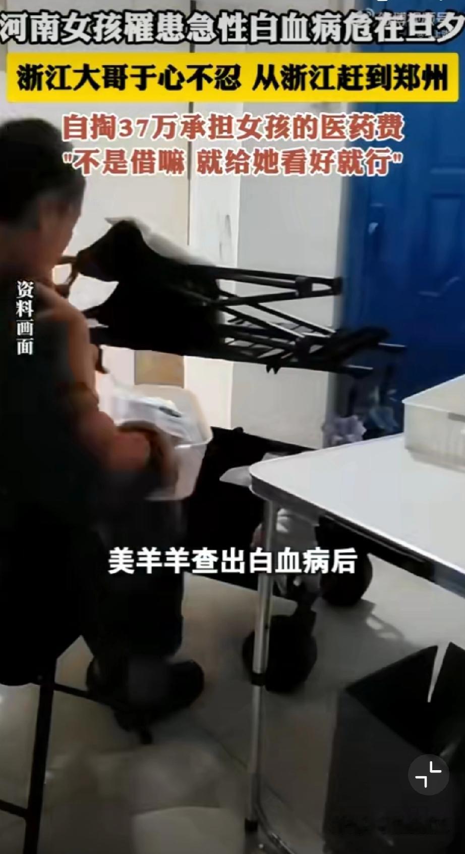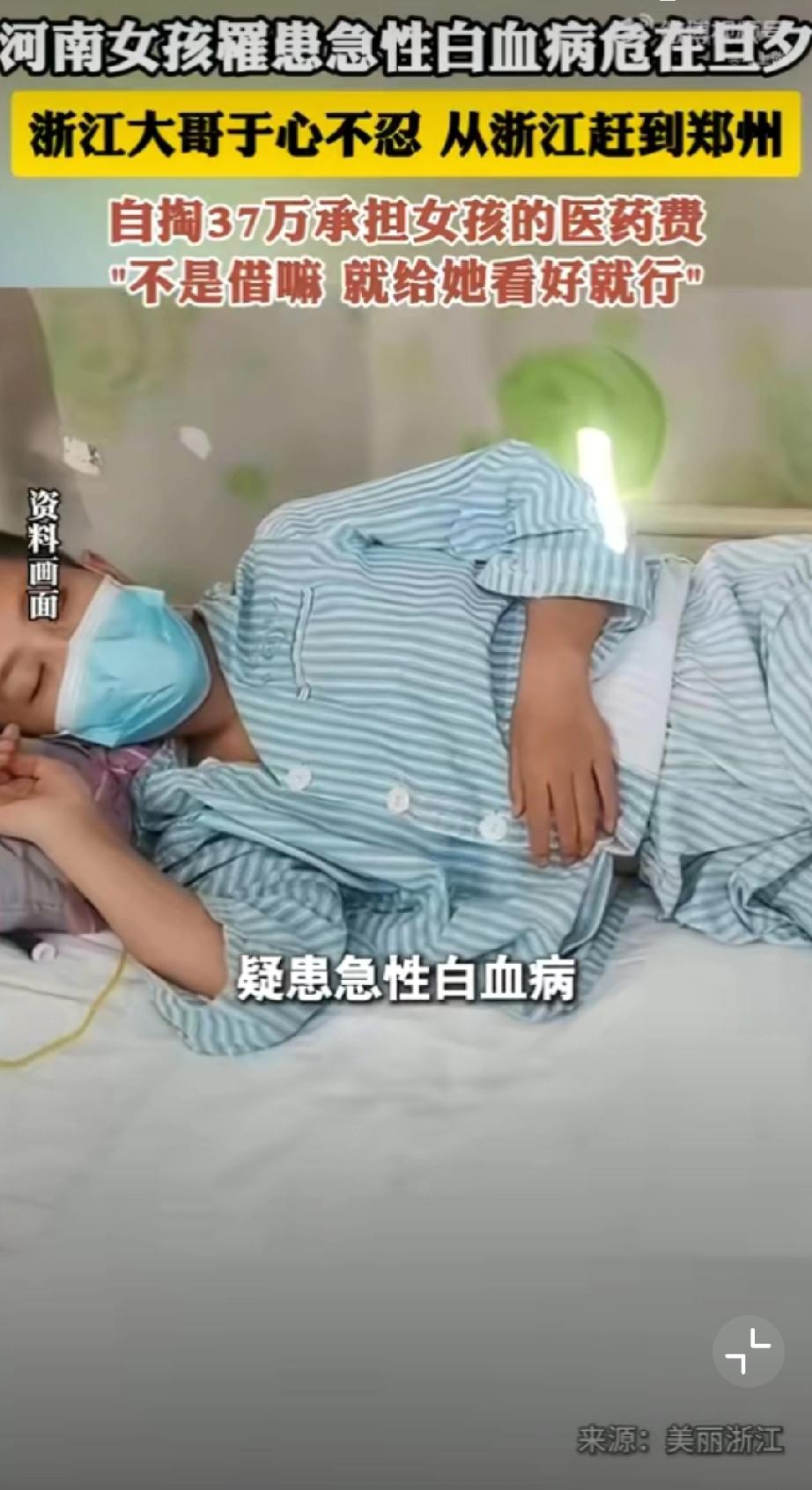 如果不是新闻报道你敢信这样的好人好事吗?河南女孩美羊羊患急性白血病危在旦夕。浙江大哥于心不忍,从浙江赶到郑州,自掏37万承担女孩医药费:“不是借,就给她看好就行”。[赞][赞][赞]