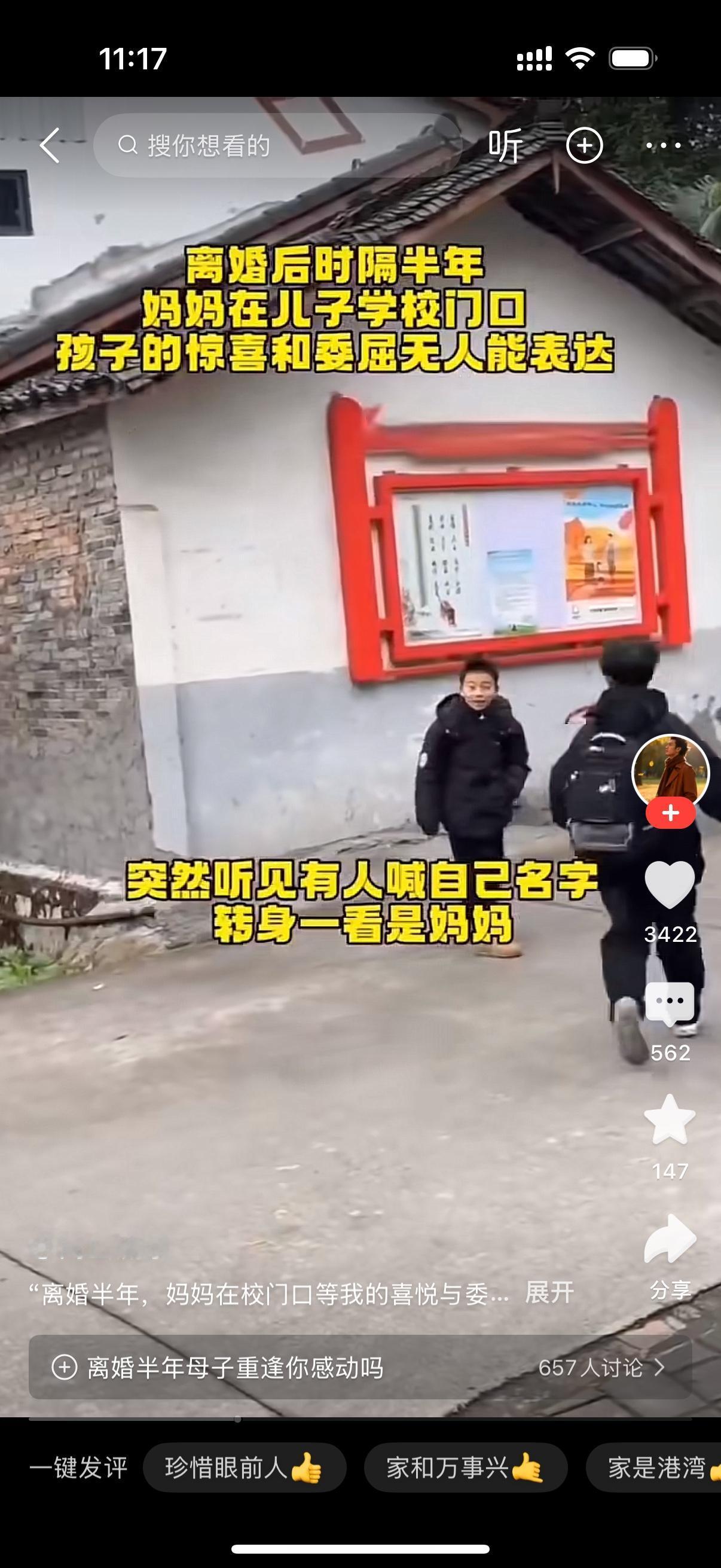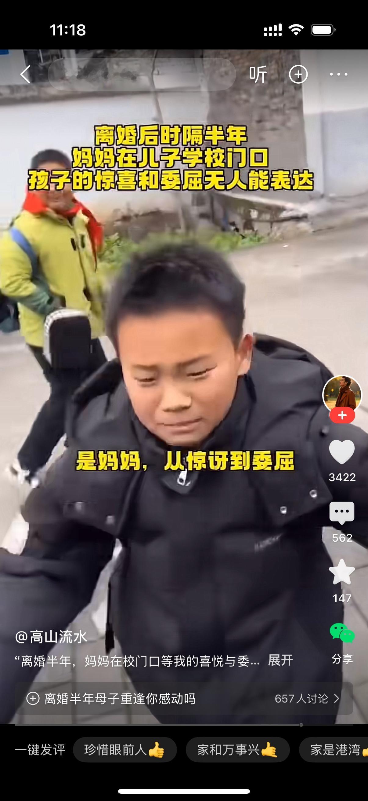 离婚后时隔半年,妈妈出现在儿子的学校门口。看到儿子飞奔进校园,妈妈大喊儿子的名字。儿子听到有人叫自己的名字,转头一看是妈妈。是妈妈,从惊讶到委屈,孩子奔向妈妈,他哭了,哭得很伤心。是啊,离婚对孩子是最大的伤害,有孩子的夫妻别轻易离婚。