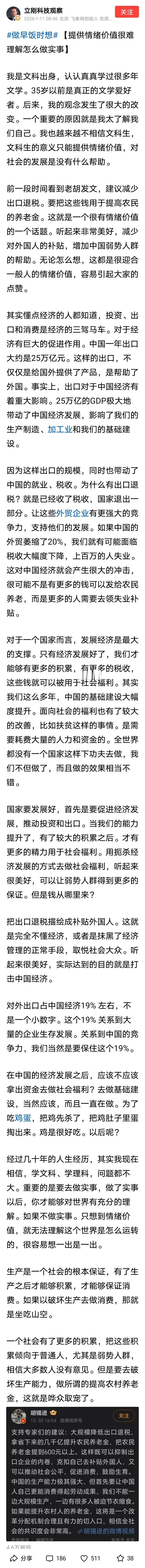 项总此言差矣!项立刚连发两篇贴文批驳胡锡进的减少出口退税说,还不忘嘲讽“文科生的意义只能提供情绪价值,对社会的发展是没有什么帮助。” 他只是看了老胡说的(老胡是蹭一波热点,泛泛而谈,确实没有给出具体数据和把问题说清楚),有一段视频是翟东升、金灿荣和一个丁姓教授一起讨论这个问题。翟东升提到现在农村老人有7000万,只要拿出2024年出口退税的40%来补贴给农村老人,就可以把农村老人平均养老金从现在的每个月220元提高到600元,这样农村老人就能过上相对体面的生活,也能分享这个时代社会、科技发展的红利,这也是社会主义的意义所在! 另外,剩余出口退税部分可以补贴给年轻人生育小宝宝上面来,因为现在我们国家的生育率太低了,14亿人口规模按正常生育率,每年出生的小宝宝大约是1600-1700万左右,而现在小宝宝出生只有900万左右(见文末附图国内20年新生儿数量)。将来如果人口继续减少,对国力影响将是巨大的,人没了什么都是然并卵! 再者,据金灿荣说,小宝宝的消费能力可以说是最强的,一个小宝宝可以拉动消费创造2.5个就业岗位。为什么?因为一个小宝宝出生后,爸爸妈妈、爷爷奶奶、外公外婆、七大姑八大姨都会围绕小宝宝的衣食住行主动消费不少,所以这也是拉动内需的有效手段! 至于项立刚所担心的,出口退税取消后会降低出口产品的竞争力,后续造成生产萎缩,导致部分人失业等等。这种担心有一定道理,但是不应放大这种恐慌情绪,从而否定翟东升和金灿荣等人的观点。理由有:其一,补贴用于农村老人、小宝宝身上拉动内需本身就能增加不少就业岗位,这与项立刚认为的出口退税取消后,造成的失业形成对冲,至于两者能不能完全抵消还有待研究。 其二,现在咱们出口的商品总体上在国际上竞争力已经很高了,即便取消出口退税依然保有强大竞争力,所以不必过于担心。再说了,由于咱们竞争力太强还有补贴,外国企业都被挤得受不了了,人家就会集中力量给你搞反倾销调查或者像美国那样给你提高关税把这部分利润吃掉,我们只会越来越卷,何苦来哉?国家高速发展几十年,国内农村老人等低收入群体也没能享受到国家发展的红利,搞社会主义意义何在?初衷在哪里? 其三,从古至今,我国经济规模大部分时间居世界前列,当时并没有依靠出口,主要是内循环也能做到长时间世界第一,这是为什么?所以不要把出口的重要性过分夸大,现在是世界更需要中国的优质产品,而不是我们还要像过去一样一味去讨好它们! 所以,我赞同翟东升、金灿荣的观点,把出口退税补贴转移到提高农村老人养老金、补贴给小宝宝生育上面来。当然,这里面出口退税也不能一刀切,对于那些竞争力还不够强大的可以酌情继续补贴嘛,那些足够强的就不必再补贴了,省下这笔钱反哺国内人民不是挺好的吗?