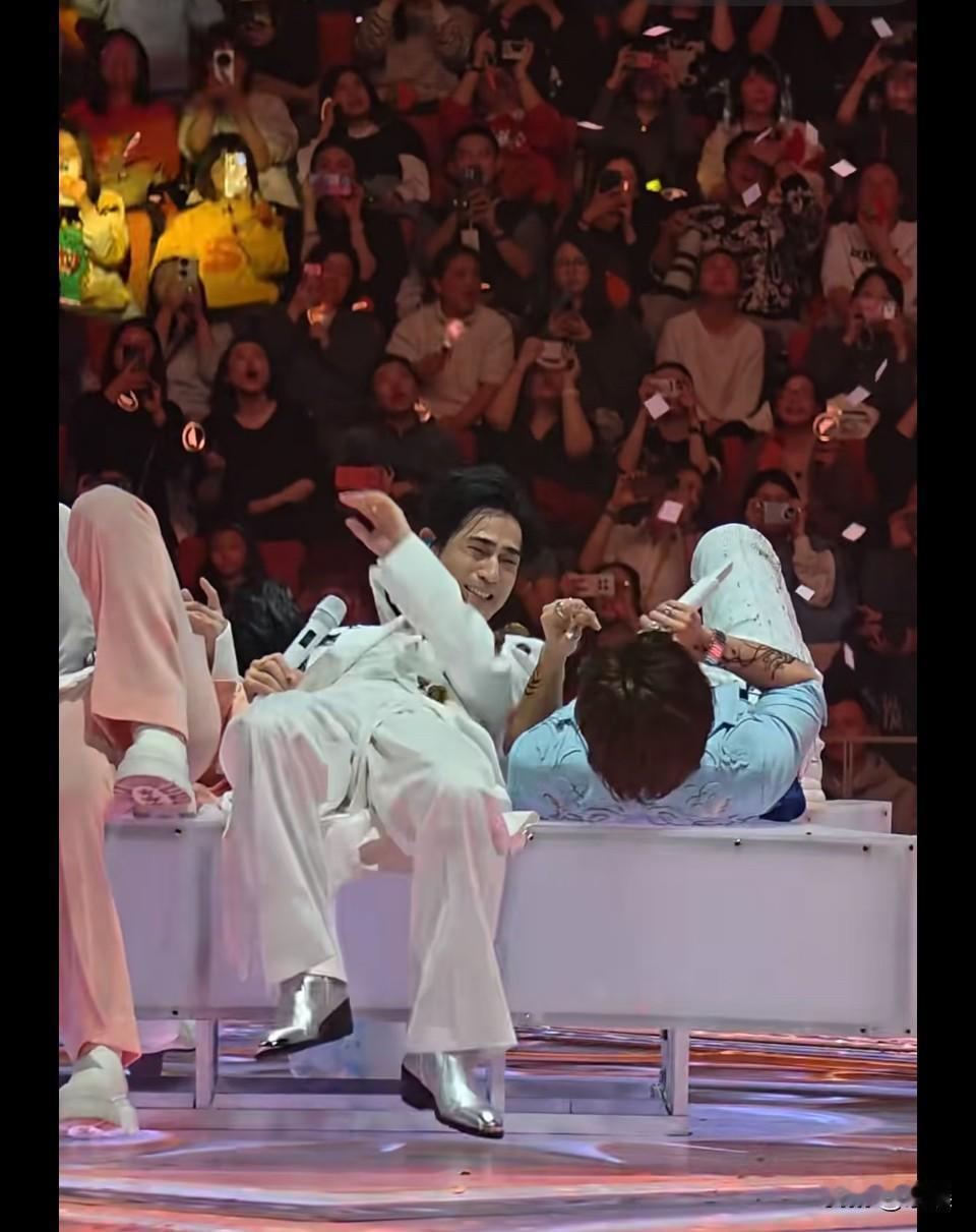原来是这样 哈哈哈 看其他视角的时候我还奇怪为什么仔仔要拍jerry! 周渝民这表情和动作好像谁家慈祥老奶在打调皮大孙儿!哈哈哈🤣 还好有个扫兴的退出,才能看到他们这么真我,享受舞台!👍 果然实现了躺着也能开演唱会。以后石头躺着弹琴也是可以的。[吃瓜群众]F4再重聚