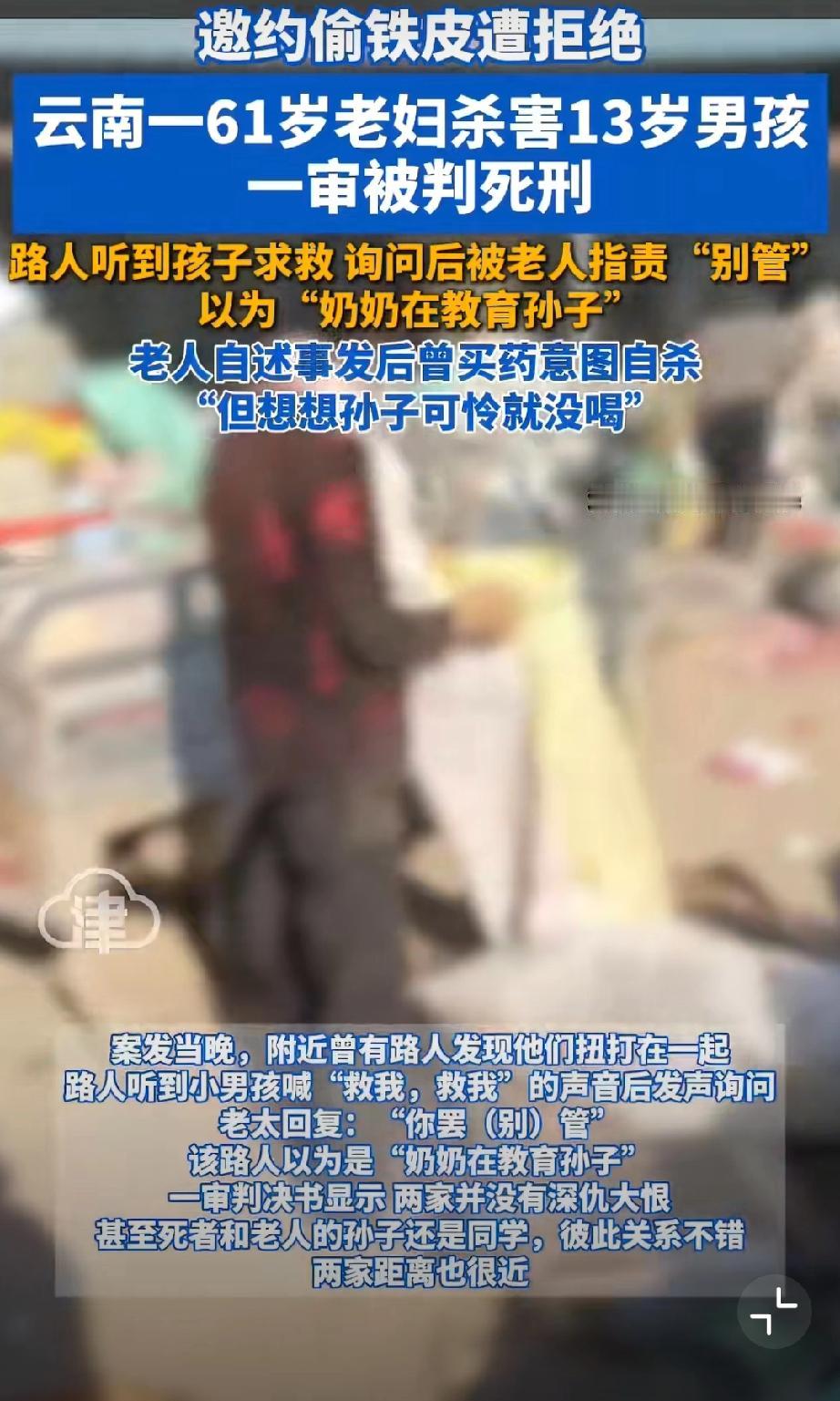 13岁男孩拒绝老妇邀约偷铁皮,被其捂晕推入河道致死…61岁老妇称,“事后也想喝药