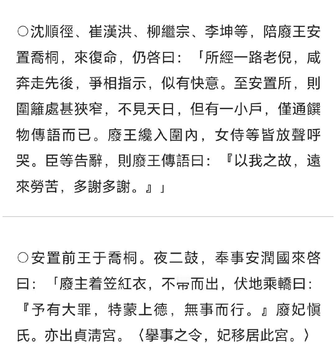 燕山君人生最后的记载(从流放到病逝) [玫瑰]中宗反正后,燕山君马上被流放。他从被流放到病逝只有两个月,在这期间朝廷主要忙着清算各种人以及更改他在位时的政策。但我今天只写跟燕山君本人直接有关的记载。 [玫瑰]“安置前王于乔桐。夜二鼓,奉事安润国来启曰:“废主着笠红衣,不带而出,伏地乘轿曰:“予有大罪,特蒙上德,无事而行。” ——燕山君立刻就被流放了,大半夜就上路了。当时他戴着斗笠、穿着红色衣服,连腰带都没系。他离开之前说自己有大罪,感谢中宗让自己无事离开。 [玫瑰]“至安置所,则围篱处甚狭窄,不见天日,但有一小户,仅通馔物传语而已。女侍等皆放声呼哭。臣等告辞,则废王传语曰:“以我之故,远来劳苦,多谢多谢。” ——到了流放地,关押地有篱笆围起来,很小,不见天日,但是他当时还有侍女照顾的。负责押送他的人走之前,燕山君说因为我的缘故,让你们大老远来一趟,真是辛苦了。 燕山君在位最后精神状态很荒诞,说了不少离谱的话,但是从权力高处坠落后,精神状态反而“正常”了,还礼貌地跟押送他的官员道歉。另外,有的电视剧拍燕山君在流放的岛屿上看海,不存在的,他行动是受限的。中宗后来把他行动范围扩大了,不过也很有限。 [玫瑰]“乔桐守直将金良弼、军官尹龟瑞来启曰:“燕山君得疫疾甚苦,非徒不能饮水,亦不开眼云。” ——燕山君九月被流放,十一月得了疫疾,“甚苦”,不能喝水甚至睁不开眼,官员禀告给中宗,中宗让医生前去治疗。 [玫瑰]“乔桐守直将金良弼、军官具世璋来启曰:“初六日燕山君,因疫疾而死。临死无他语,但欲见慎氏。” ——然而没等到医生到达,燕山君很快就去世了,临死前没有说其他话,只说想见他的妻子慎氏。“临死无他语,但欲见慎氏”是他人生留下的最后记载。 燕山君正好死在了他三十岁生日的前一天。 ——————————— 1.推翻燕山君是朝臣共识,他宠信的一些大臣仗着他的宠爱而作恶,但是看他大势已去,立马投向反正功臣,答应一起推翻燕山君。慎妃的表现完全相反,她约束好自己,从不作恶还劝谏燕山君,在燕山君大势已去被推翻后,她哭着请求和他一起被流放(“至是号泣,必欲从王而去,不得”)。 2.影视拍过燕山君和慎妃在被流放前见了一面,我也约过类似内容,但是从史料来看,他们当时真的不像见过最后一面。 历史同人 燕山君 燕山慎妃 李氏朝鲜