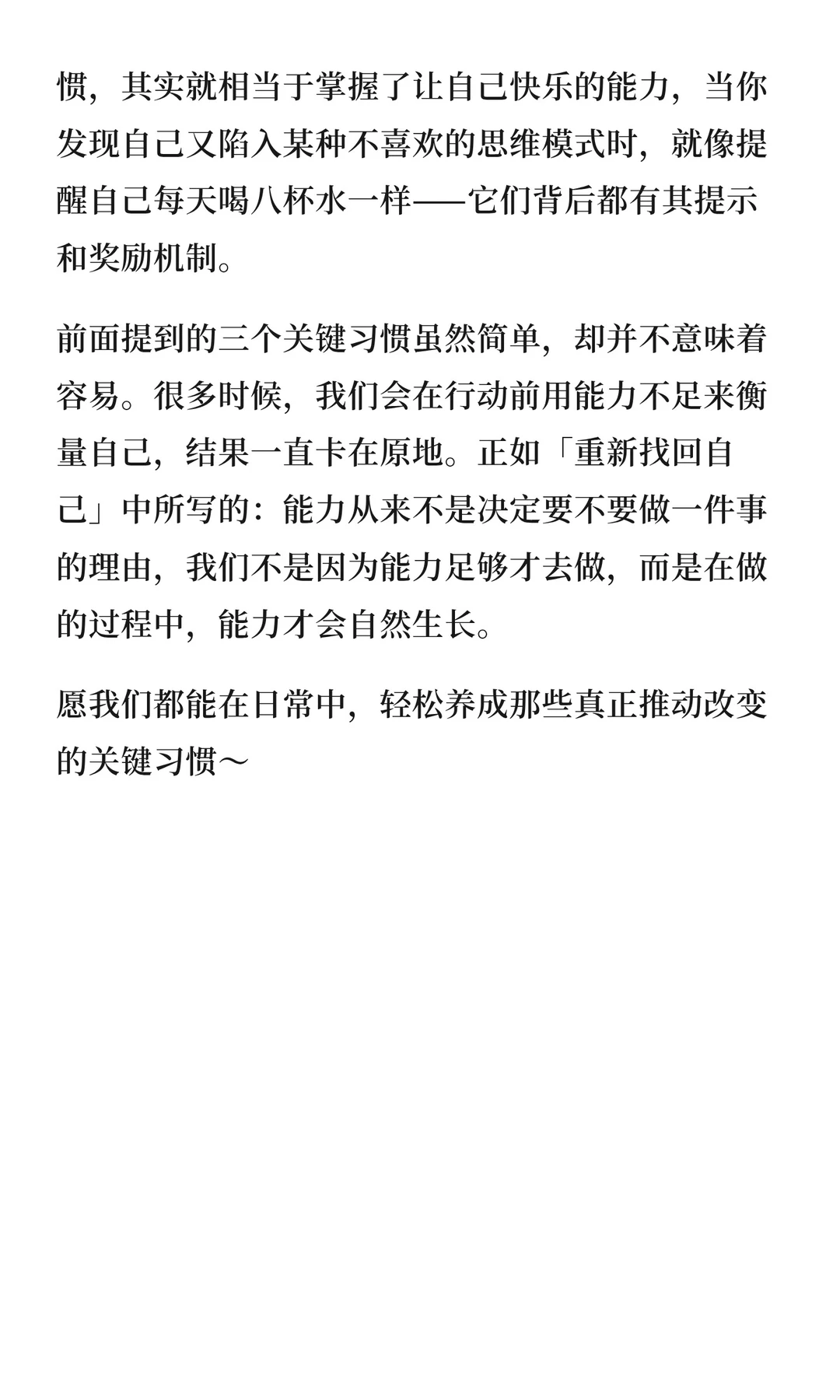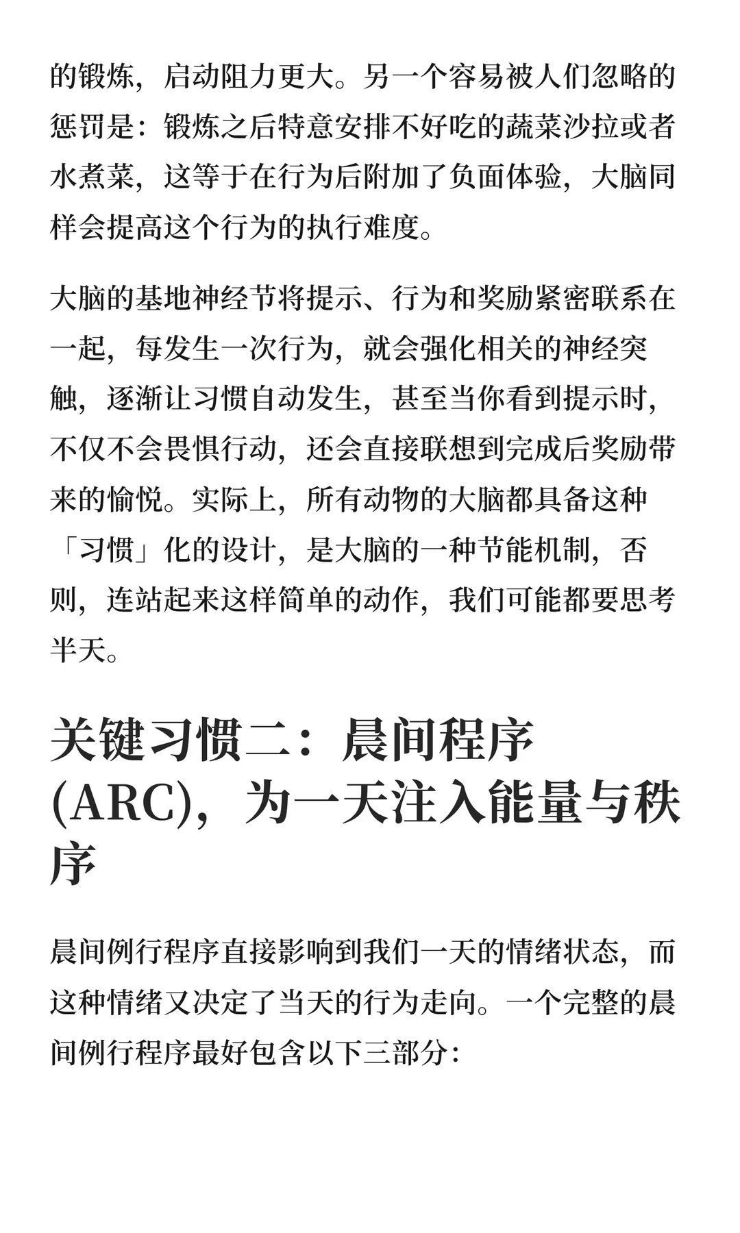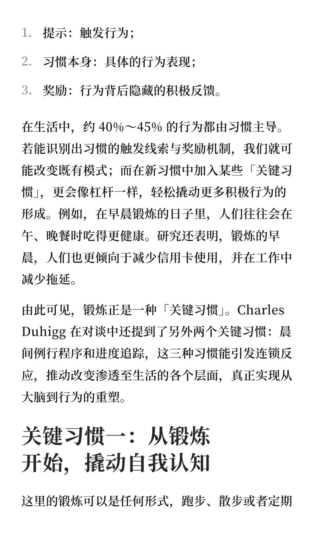 由【提示-行为-奖励】构成,生活中45%的行为都由它驱动。找到“关键习惯”,就能像杠杆一样,带动更多积极改变💡