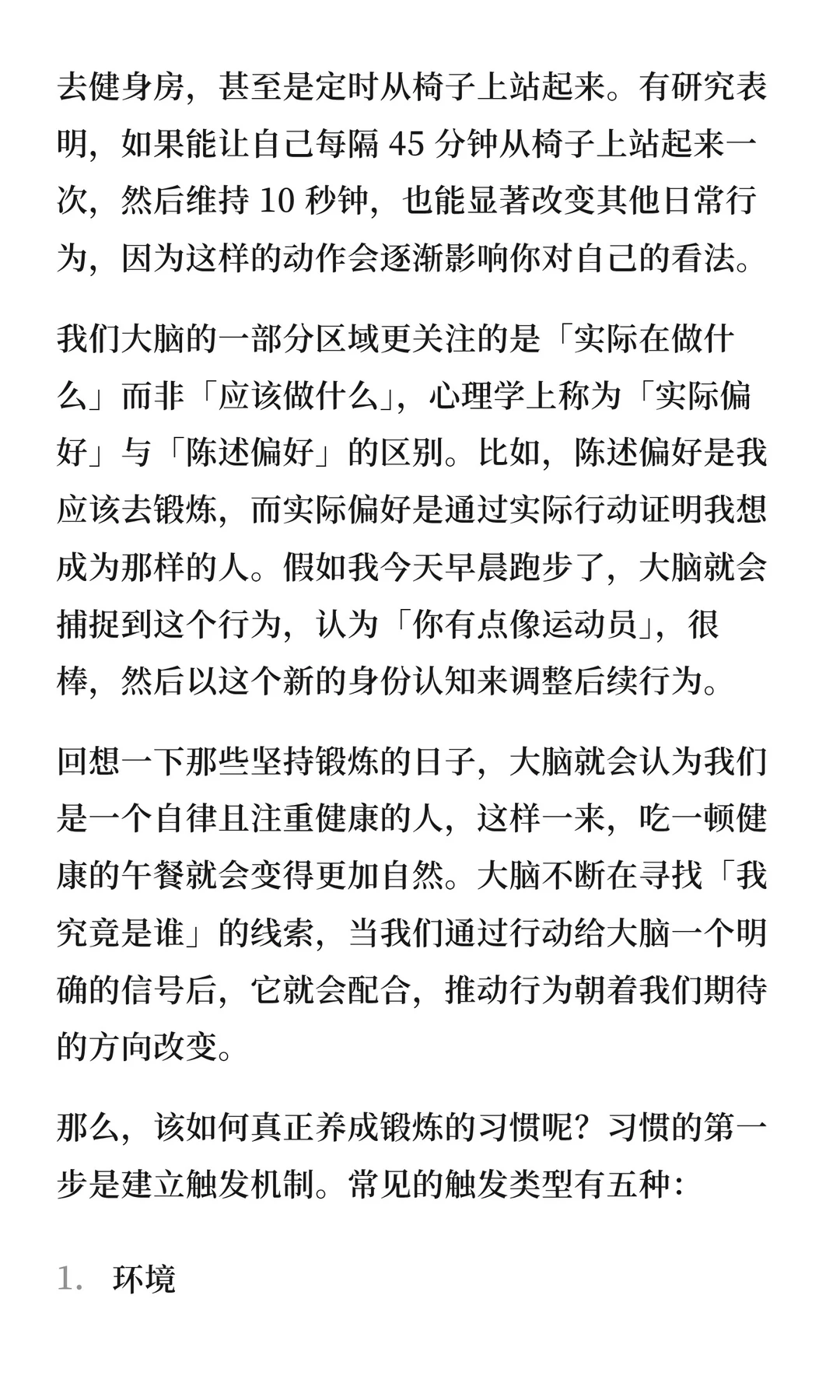 不一定是高强度运动,哪怕每天定时站起10秒钟,都能改变你对自己的看法。大脑会捕捉行为,确认“你像个自律的人”,从而推动你更自然地选择健康午餐、减少拖延。