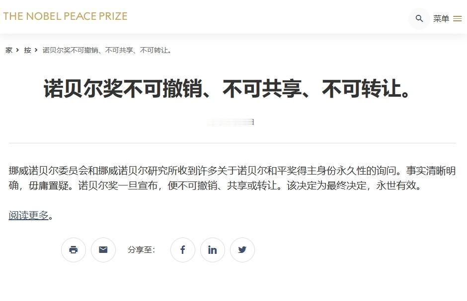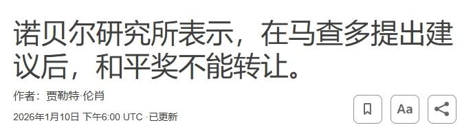 和平奖还能转让?诺贝尔委员会急了 眼看着特朗普和马查多对和平奖该归谁的“讨论”越来越离谱,诺贝尔委员会终于急了。 1月10日,路透社注意到,挪威诺贝尔委员会发布了一份声明。声明称,近期委员会收到了大量关于和平奖得主身份永久性的询问,故对此作出回应:一旦和平奖被宣布,就不能撤销、分享或转让给他人,这是最终决定且永远有效。 虽然这份声明通篇没有点任何人的名字,但相信大家都知道,它针对的是谁。 最近特朗普和委内瑞拉反对派领导人马查多隔空上演了一出“和平奖归属权”的闹剧: 一个明明对诺贝尔和平奖垂涎三尺,却偏要装出一副“不是我想要,是别人非要给”的姿态,频频在社交媒体上阴阳怪气; 另一个则在看到自己与委内瑞拉总统宝座擦肩而过后,才“幡然醒悟”,高调表示愿意把本不属于自己的和平奖“奉献”给特朗普。 当然,更滑稽的是诺贝尔委员会。这些年诺贝尔和平奖不是颁给战争贩子,就是颁给充当美西方走狗的“民主斗士”,其含金量早已被诺贝尔委员会败坏干净,沦为国际笑柄。 但偏偏诺贝尔委员会还想“既要又要”:一边把和平奖当作政治工具肆意挥霍其价值,一边又要端着“公正”“永久”“神圣不可侵犯”的架子,明知特朗普觊觎奖项,却把它塞给马查多,摆出一副“就是不向特朗普屈服”的清高架势,属实令人作呕。 说到底,这场闹剧里没有赢家。特朗普得不到想要的桂冠,马查多留不住已有的光环,而诺贝尔委员会则再一次把自己那点仅剩的信誉往泥坑里踩了踩。或许正如有人调侃的那样:如今的诺贝尔和平奖,唯一还能证明的,就是“和平”二字有多么遥不可及。