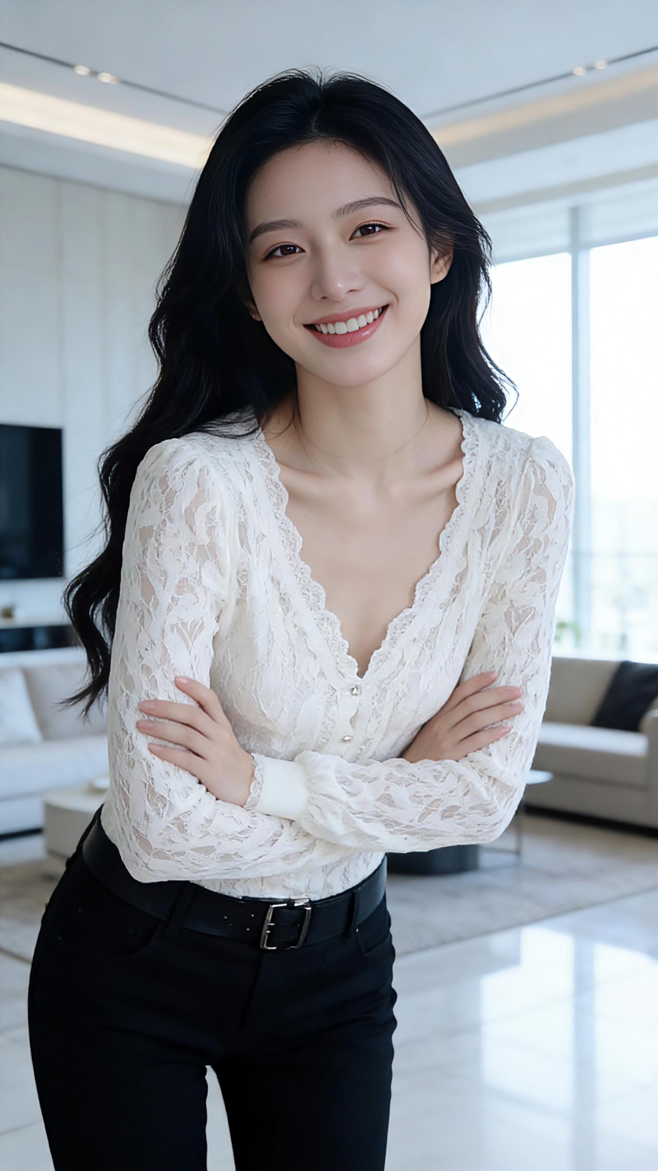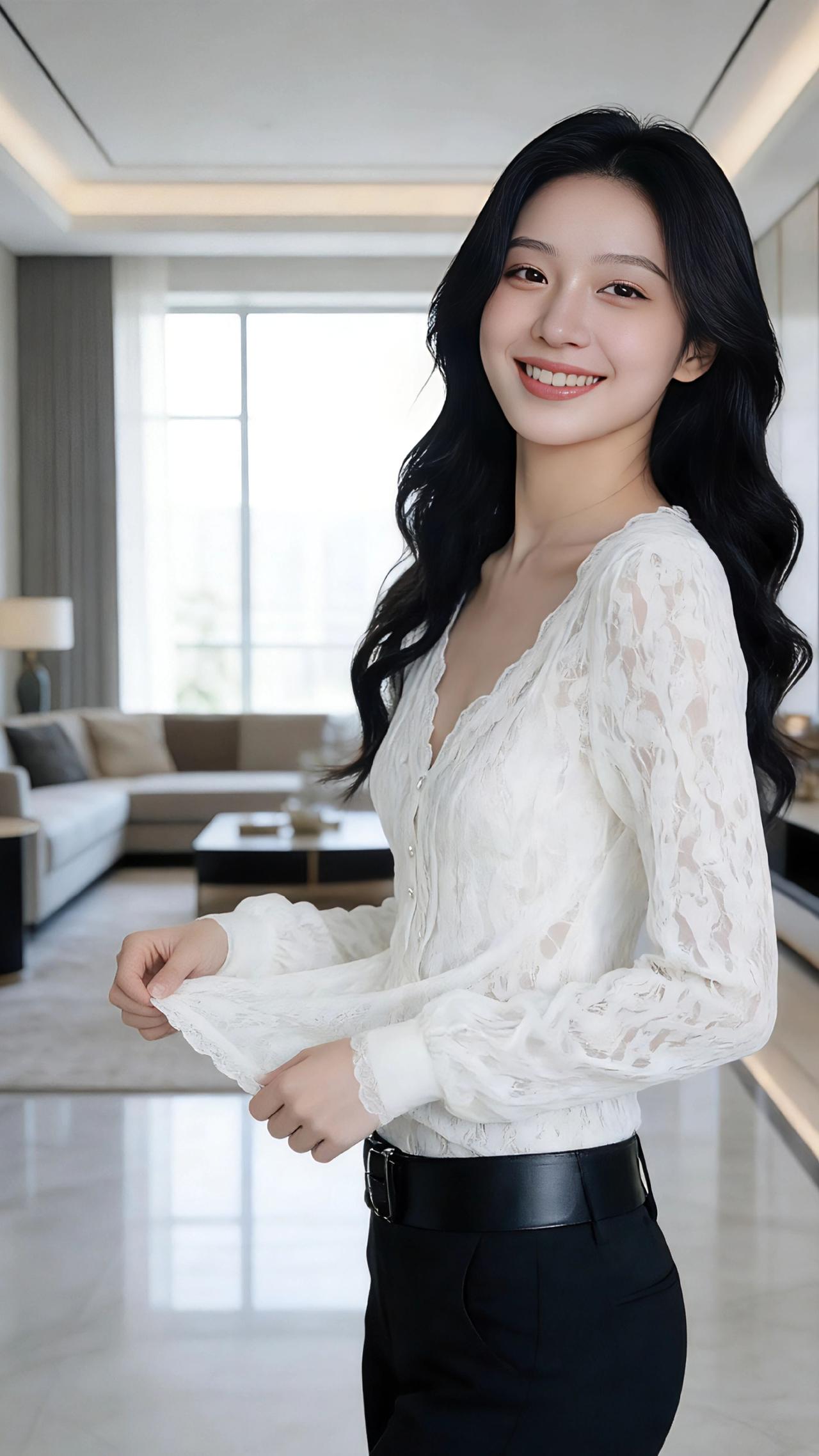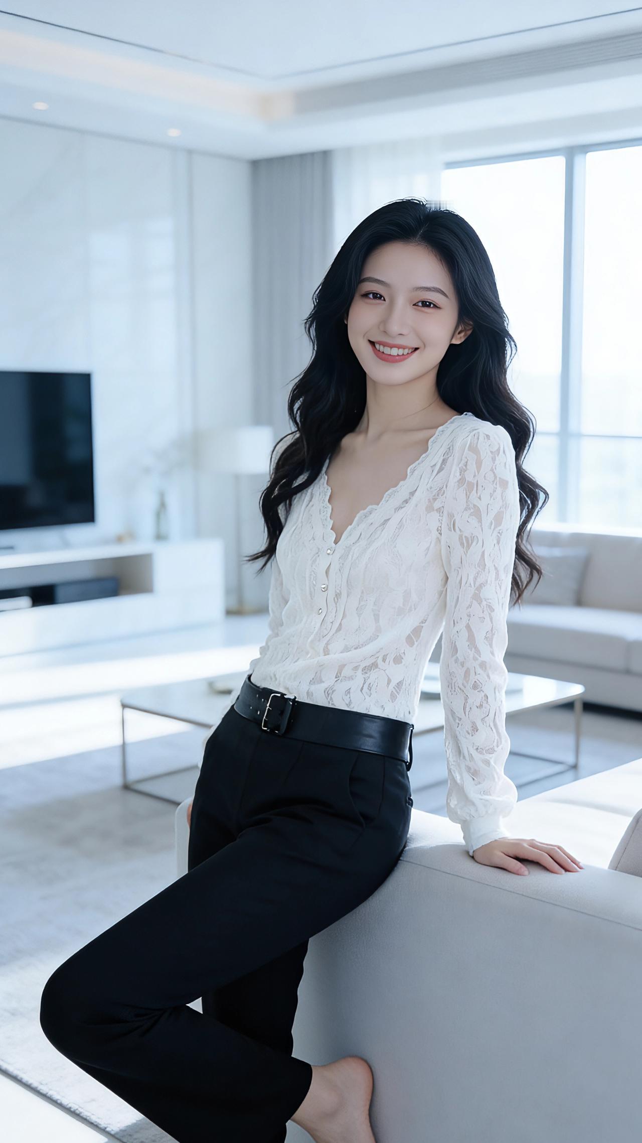蕾丝与光,织一室温柔 明亮的客厅里,阳光透过落地窗淌进来,在光洁的地板上铺成一片柔软的金。女孩身着的白色蕾丝衫,成了这片光影里最缱绻的风景。 蕾丝的纹路如镂空的花笺,在肌肤上晕开朦胧的美,V领的弧度勾勒出脖颈的纤细,袖口的蕾丝花边轻轻垂落,像栖落了一缕春日的云。搭配利落的黑色长裤,皮质腰带收出腰身的曲线,柔与刚的碰撞,让蕾丝的柔美多了几分飒爽的底气。 她双臂轻抱时,蕾丝的肌理在光影里若隐若现;倚着沙发侧坐,长腿交叠的姿态慵懒又优雅;抬手拢发的瞬间,指尖划过蕾丝的纹路,笑意从眼角眉梢漾开,像揉碎了的星光落进眼底。蹲坐在绒毯上时,蕾丝的轻盈与黑裤的沉稳相融,明媚的笑容裹着阳光的温度,让这方客厅的每一寸角落,都漾着温柔又灵动的气息。 原来蕾丝从不是只有甜腻,与简约的黑裤相配,便能在柔媚中生出利落的风骨,在光影流转间,演绎出独属于女性的万种风情。 高级感穿搭 时尚穿搭 新年穿搭 蕾丝衬衫