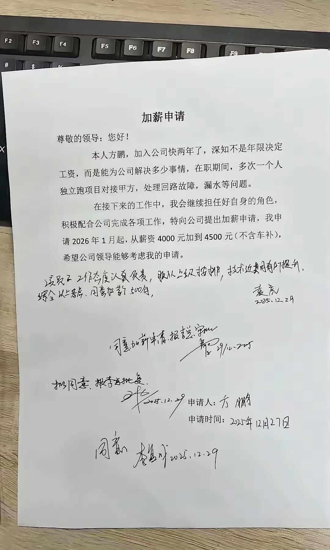 看到这份加薪500块的申请,真心说现在的打工牛马真难。不过是加500块的人工而已,正经写的加薪申请,经过四个领导审批,先直接领导写了工作证明,后面的领导一层一层的批准,字越来越少,经历了3天。如果不看金额,以为是几十万,需要严格的审核流程。工作升迁 领导主动加薪 领导主动加薪术