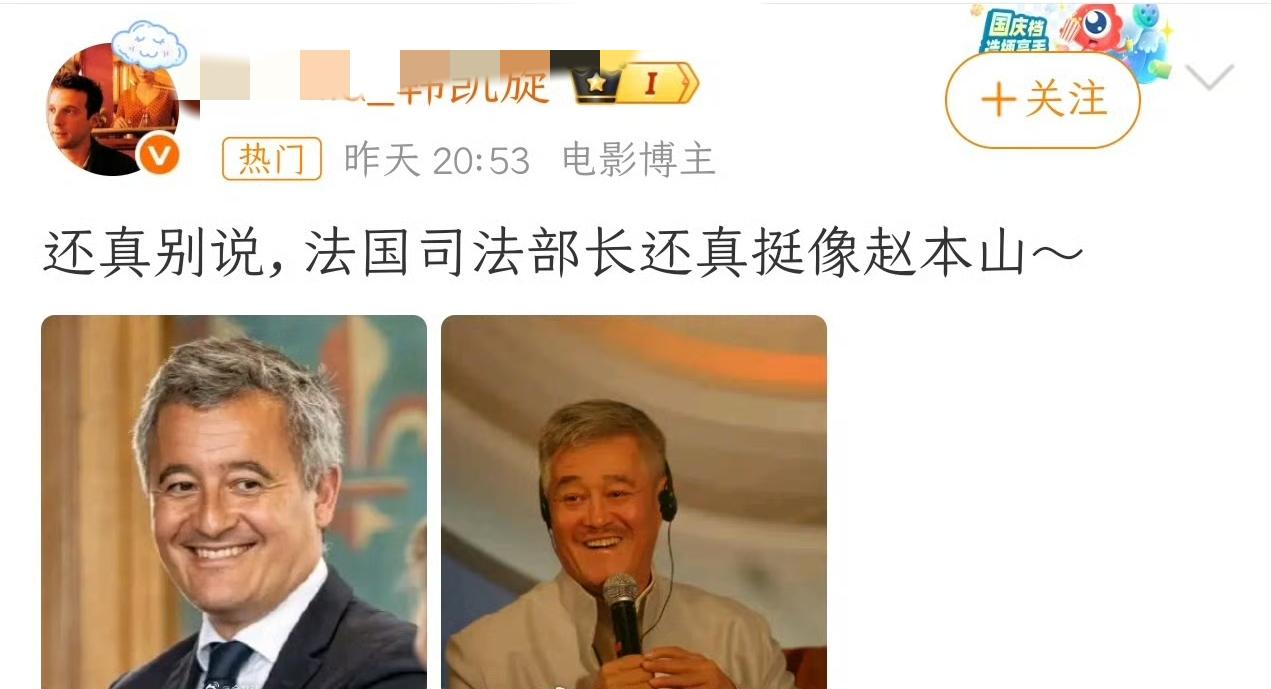 法国司法部长撞脸赵本山?全网都在找“法国分山”! 这事儿还得从一张照片说起。就这两天,法国现任司法部长热拉尔德·达尔马宁的一张照片,突然在中国网络上火了。 不为别的,就因为某些角度下,他那脸型、发际线,特别是笑起来的神态,跟咱们的喜剧大师赵本山,像得离谱。 网友直接炸了锅,话题叫“法国司法部长撞脸赵本山”,阅读量蹭蹭破百万。大家一边乐,一边送上外号“法国分山”。有人把他俩照片拼一块,不仔细看还真以为是同一个人。 更逗的是,有网友翻出赵本山年轻时的照片,非说那是法国部长旧照,这脑洞开得,拦都拦不住。 很快,大V们也加入了这场欢乐派对。对比图、表情包、混剪视频全来了。有人把部长讲话的侧脸,和赵本山小品片段剪一起,毫无违和感。 评论区更是金句不断,什么“欢迎来春晚客串”、“宇宙的尽头果然是铁岭”,玩梗玩到飞起。 其实啊,这种跨国撞脸挺常见。之前不还有普京像郭德纲,马克龙像夏雨么。说白了,就是大家用自己熟悉的娱乐符号,去化解国际政治那点严肃感,图一乐呵。 加上赵本山老师前段时间刚因为给徒弟题字的事重回视线,大伙儿正怀念呢,这“法国分山”来得正是时候。 不过得提一嘴,现在法国部长确实是这位达尔马宁,可别跟前任搞混了。整个事件看下来,讨论特别纯粹,就是欢乐。没啥政治解读,全是民间自发的趣味联想。 看着两国网友因为一张脸,乐呵呵地跨时空共鸣,倒也挺暖的。这世界有时候真小,有趣的灵魂,指不定在哪儿就碰见“世另我”了。