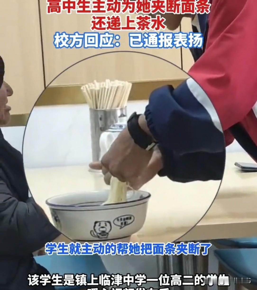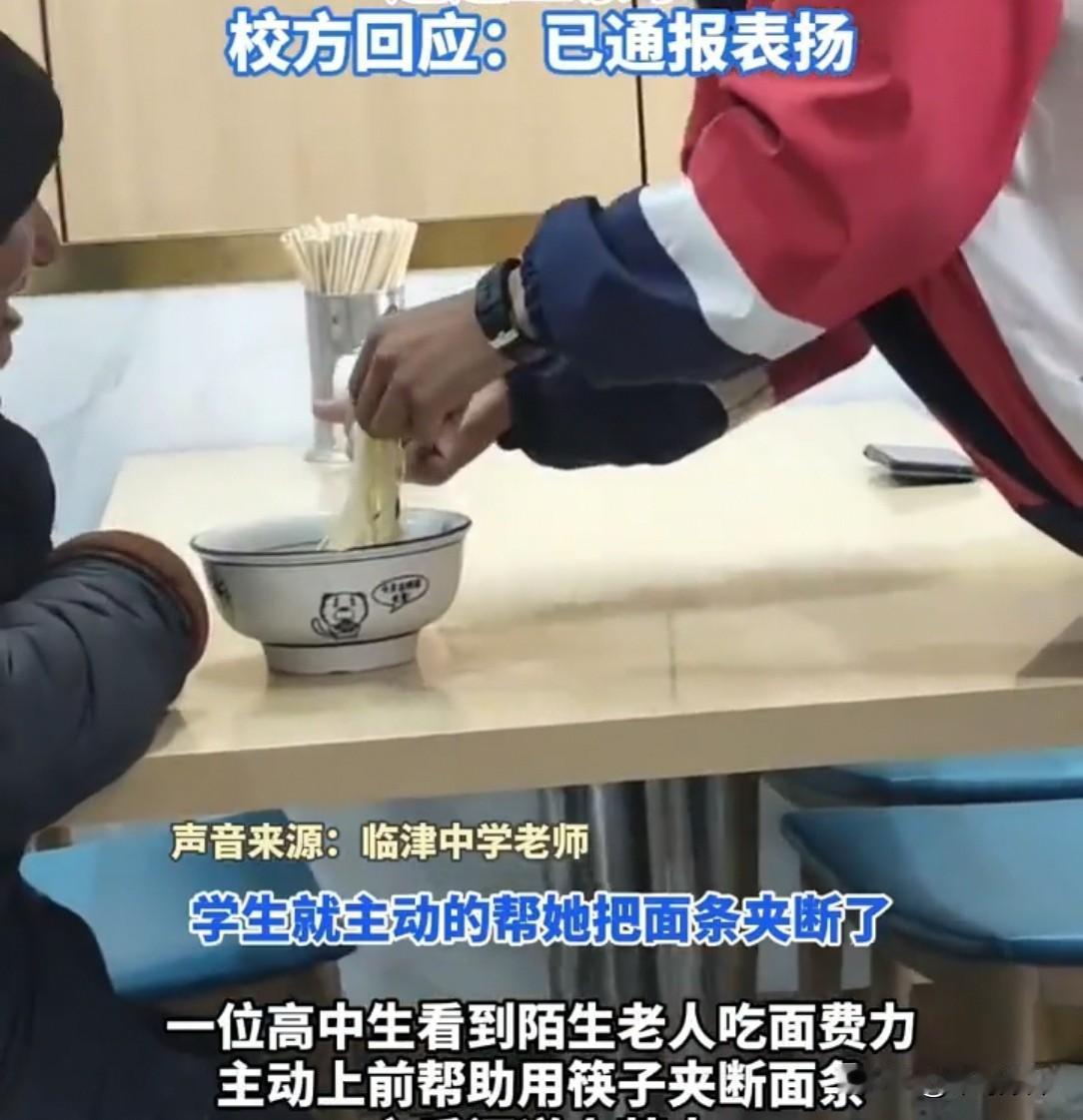 甘肃一面馆,老人饿得肚子咕咕叫,可双手却直打颤,夹面条总打滑。她抬头想找人搭把手,谁知,旁人都低头躲开。就在这时,传来一道男声,“奶奶,我来帮你。” 这话一出,立马吸引了其他人的注意,大家都想看看这位勇士是谁。 1月9日下午4点多,甘肃大河家镇一面馆坐满了人,吸溜面条的声音、闲聊的声音混在一起,热闹得很。 角落里,一位佝偻着背的老人独自坐着,面前摆着一碗热气腾腾的牛肉面。 她的肚子早就饿得咕咕叫,喉咙里一阵阵发紧,眼睛盯着碗里根根分明的面条,干枯的手指颤巍巍地握住筷子。 老人想夹起一筷子面送进嘴里,可双手抖得厉害,筷子尖刚碰到面条就滑开,试了好几次,面条愣是一根没沾到。 汗水顺着老人的鬓角淌下来,她有些窘迫地抿了抿干裂的嘴唇,抬眼望向周围吃饭的人。 那双浑浊的眼睛里满是希冀,像溺水的人想抓住一根救命稻草。她张了张嘴,却没好意思发出声音,只是用目光在一张张陌生的脸上扫过。 店里的人察觉到老人的目光,纷纷低下头。 有人假装专心致志地扒拉面条,筷子戳得碗叮当响;有人掏出手机,手指飞快地滑动屏幕,眼角的余光却偷偷瞟着老人;马女士也在其中,她刚点完招牌面,正坐在角落等餐。 看到老人那副模样,她心里咯噔一下,泛起一阵不忍,可转念一想,万一自己帮忙时老人有个好歹,说不清楚怎么办? 这个念头一冒出来,她赶紧低下头,假装盯着手机屏幕,指尖却有些发凉,连屏幕上的字都看不进去。 大家低头的动作整齐得不像话,仿佛那碗里的面条是什么山珍海味,值得所有人目不转睛。 老人的目光一点点黯淡下去,她叹了口气,无力地放下筷子,双手交叠放在腿上,盯着碗里渐渐变凉的面条,眼眶微微发红。 就在这时,一道清亮的男声突然响起,打破了店里微妙的沉默:“奶奶,我来帮你。” 这话一出口,店里瞬间安静了几分,所有人都不约而同地抬起头,目光齐刷刷地投向声音的来源,好奇这位“勇士”到底是谁。 马女士也猛地抬起头,心里嘀咕着:这谁啊,胆子这么大? 只见一个穿着蓝白相间校服的男生,从后排的座位上站起身。 他个子高高瘦瘦的,脸上带着少年人特有的青涩。 男生快步走到老人桌前,微微弯下腰,声音放得更柔和了:“奶奶,我看你夹面不方便,我帮你把面条夹断吧,这样吃着就省事了。” 老人愣了愣,随即连连点头,眼里重新亮起光来,哽咽着说:“谢谢你啊,孩子,真是麻烦你了。” “不麻烦的奶奶。”男生笑着摆摆手,他先轻声问过老人的意见,然后才拿筷子。 他的动作很轻柔,一双筷子稳稳地把碗里的长面条,一根一根夹断成小段。阳光落在他的侧脸上,给他的轮廓镀上了一层金边,看起来格外温暖。 夹完面条,男生又从旁边拿了一双新筷子递给老人,“奶奶,你用这双新的,吃着干净。” 说完,他又想起什么似的,跑到饮水机旁,接了一杯温热的水,端到老人手边,“奶奶,吃完面喝点水,暖暖胃。” 老人看着眼前的少年,嘴唇动了动,想说些什么,最终只化作一句重复的“谢谢,好孩子,真是个好孩子”。 这一幕,被角落里的马女士完完整整地拍了下来。 她举着手机的手有些颤抖,心里又暖又涩。 暖的是少年的善良,涩的是自己刚才的犹豫。 她看着男生回到座位,继续埋头吃自己的面,仿佛刚才只是做了一件再平常不过的小事,店里的人却都没再低下头,目光里带着赞许和一丝愧疚。 马女士的面很快端上来了,可她却没什么胃口。她看着老人小口小口地吃着断成小段的面条,脸上露出满足的笑容,心里忽然亮堂起来。 老话讲“赠人玫瑰,手有余香”。当时店里人不是冷漠,只是怕帮忙惹上麻烦,都没敢伸手。而少年弯腰夹面后,无事发生,也让大伙心里又暖又亮堂,原来善良真的只是举手之劳!