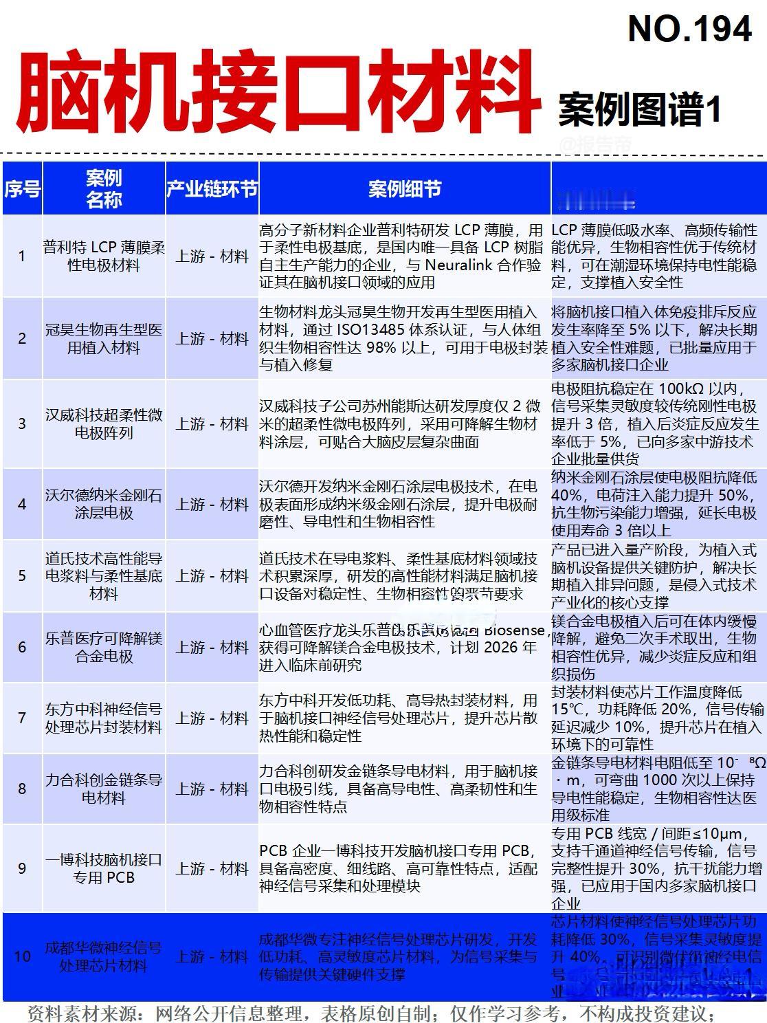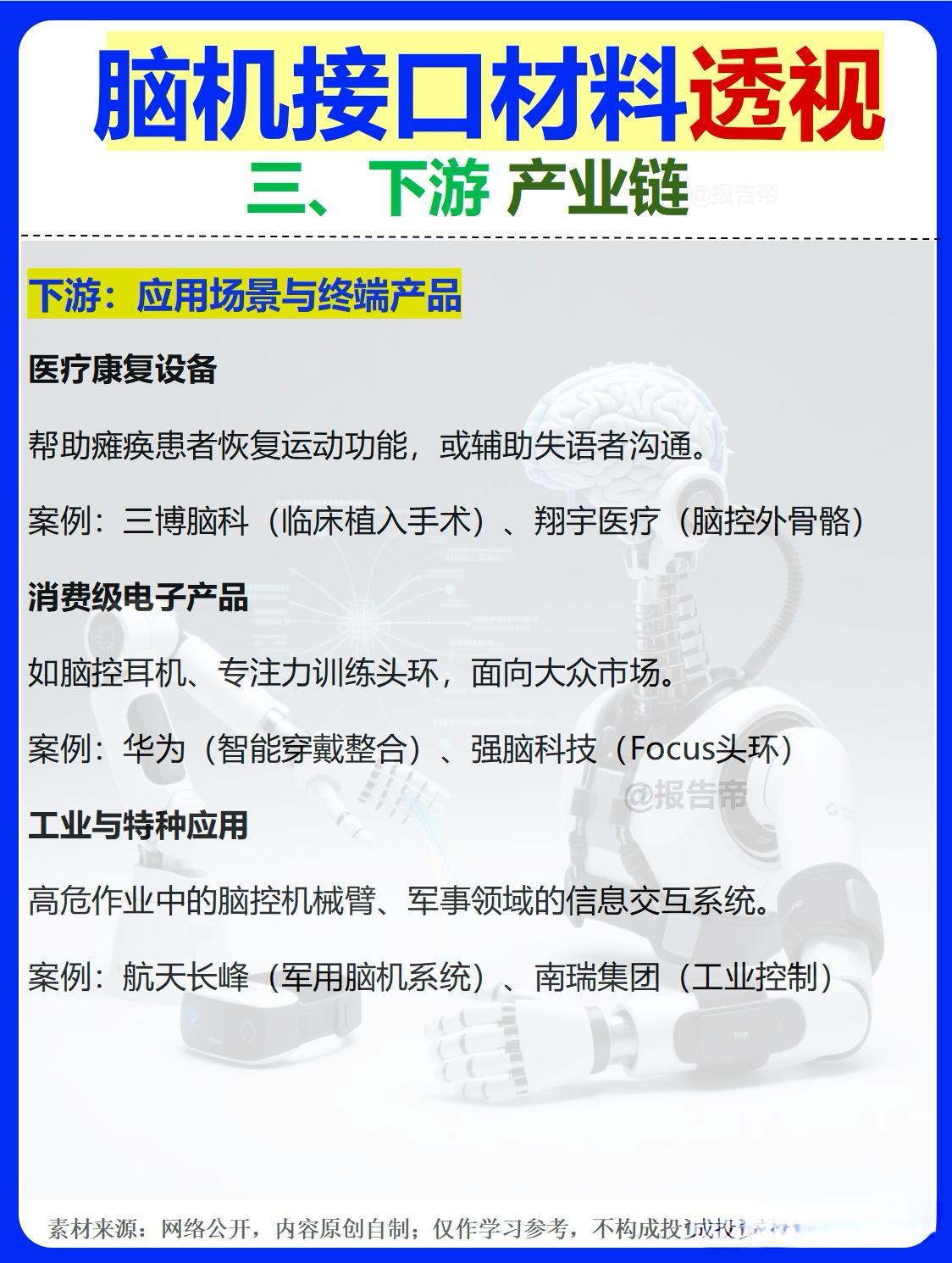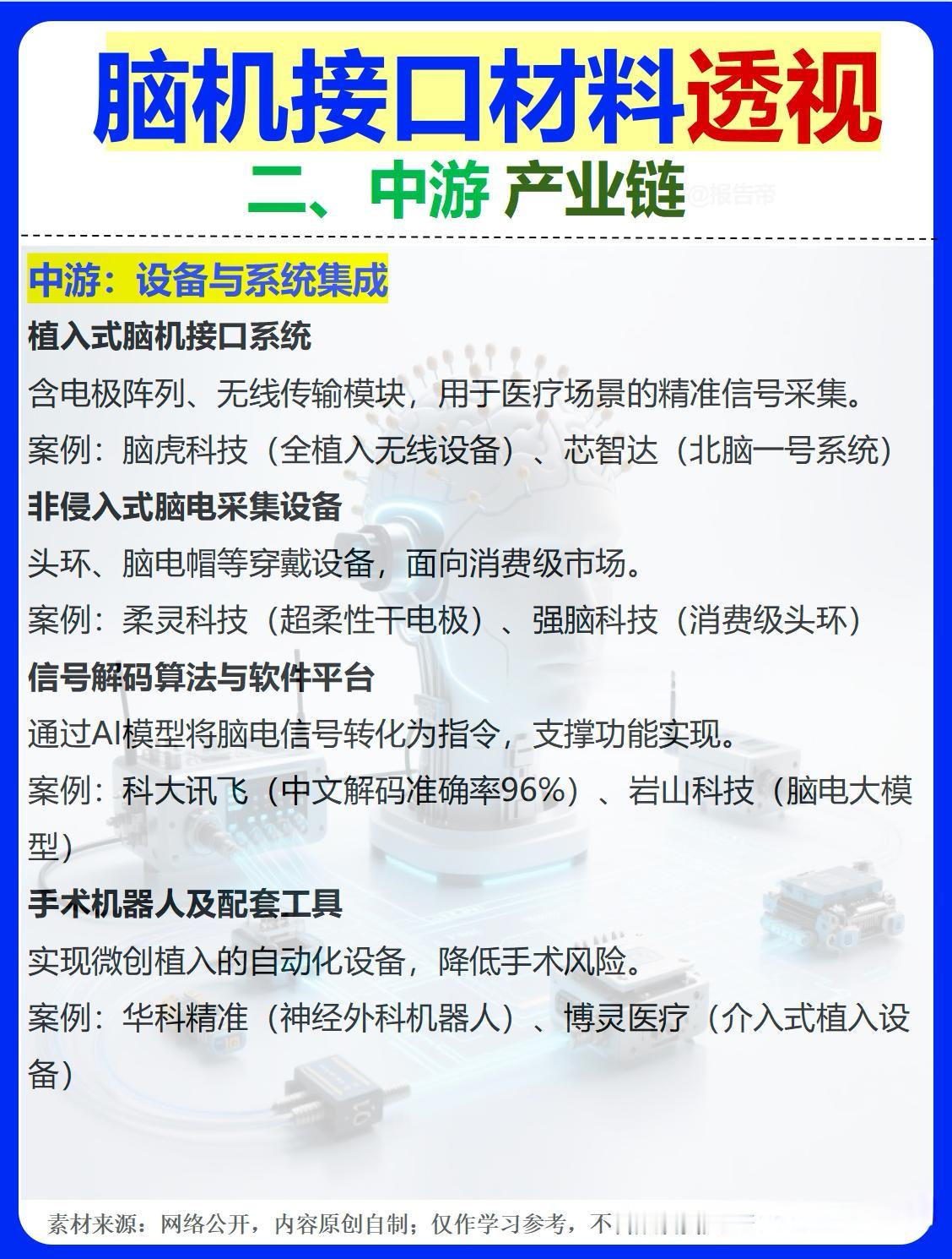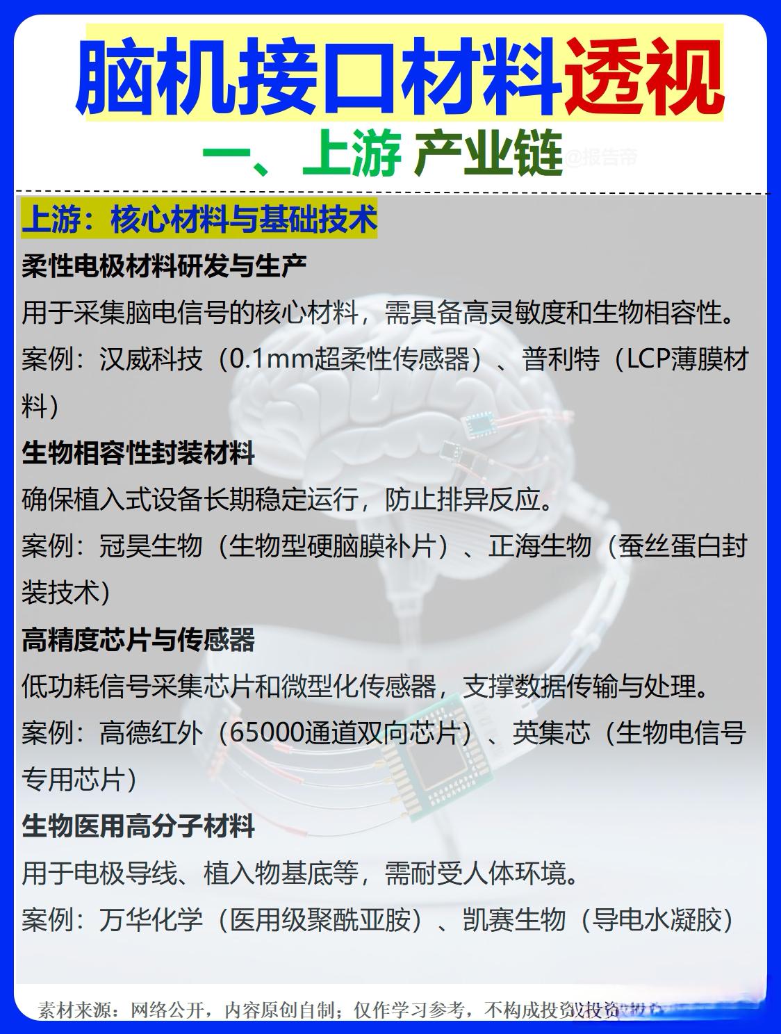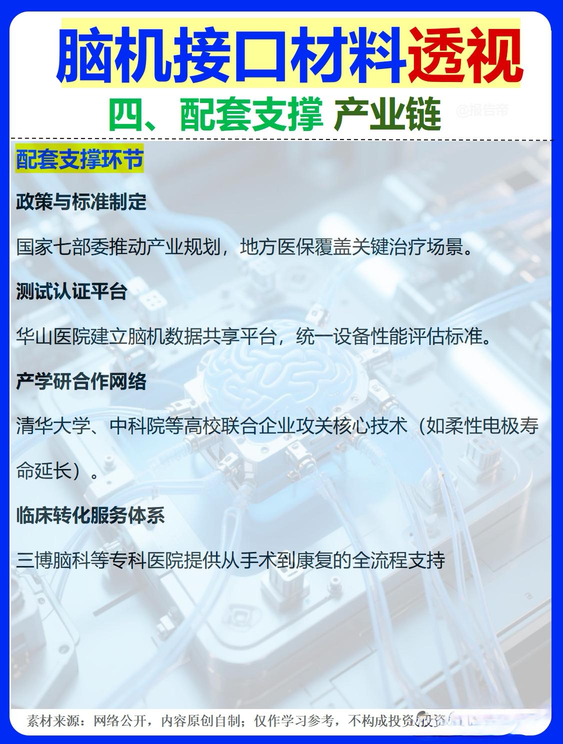 脑机未定,材料先行! 脑机接口的技术路线、落地场景还在博弈,但材料是绕不开的刚需。不管是侵入式设备用的柔性电极材料、生物相容涂层,还是非侵入式的导电传感材料,都是实现大脑与机器信号连接的核心, 没有这些材料,再先进的设计也没法落地。脑机接口、脑机接口材料相关 1、【现状】 国内行业已经提前布局,企业和科研机构在柔性基底、医用级生物材料等领域实现突破,部分材料已完成小批量验证。政策加持下国产替代提速,供应链和技术储备逐步完善,即便脑机设备尚未大规模量产,材料环节已成为产业链中的有谱项。 2、【深度】 本文的精简源于“产业链短图文”风格,但洞察的深度一如既往。