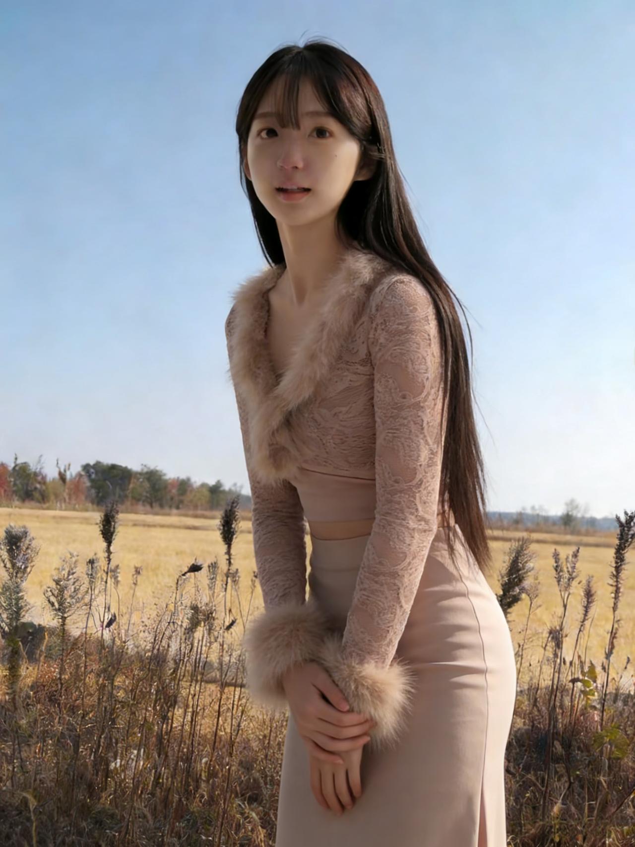 落日下平芜, 万里秋图。 粉裙人立小桥隅。 长发随风飘似雪, 拂过青蒲。 ~ 何处寄情无? 水远山孤。 回眸一笑胜明珠。 若把此身比明月, 照彻江湖。