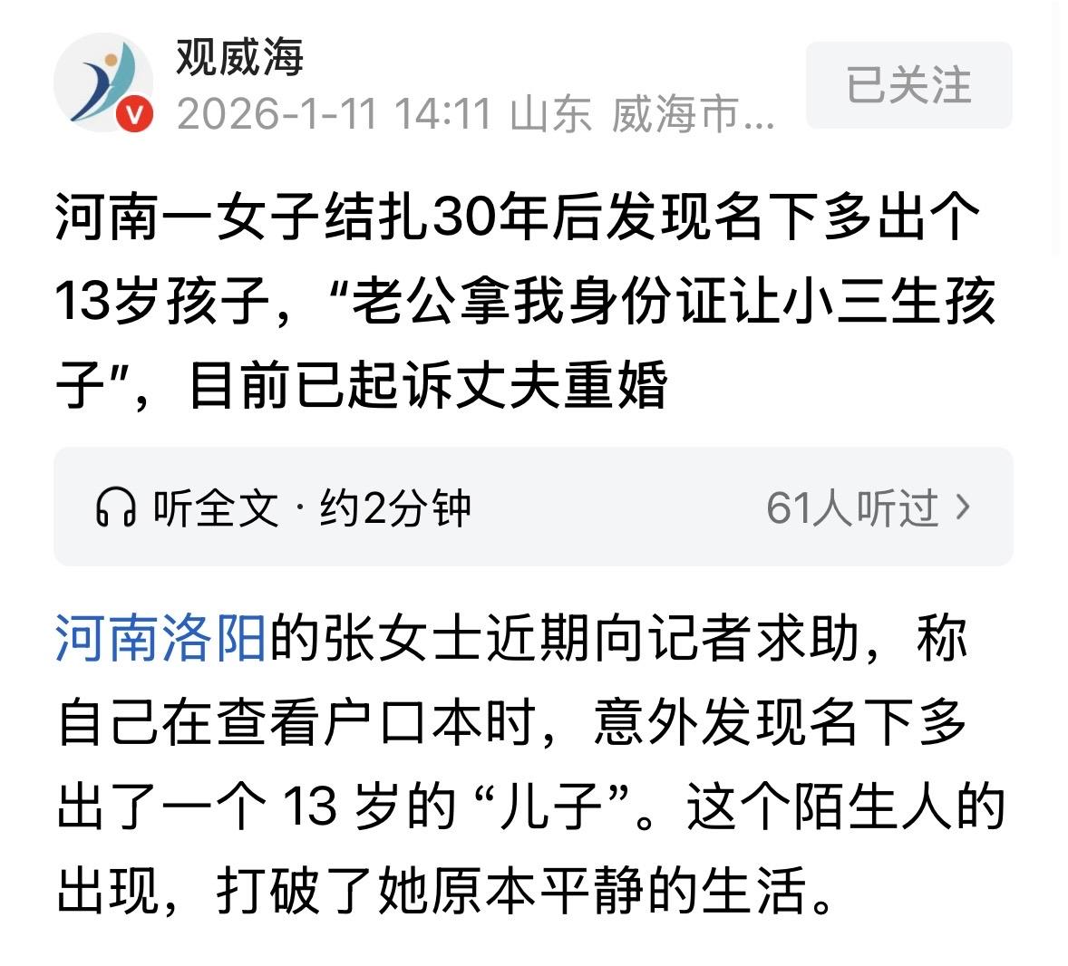 “好一招瞒天过海!”河南洛阳,女子已经到了当奶奶的年纪,却发现自己突然有了个儿子,那孩子登记在她家户口本上,已经13岁,可她已经绝育30年,孩子怎么来的?她带着疑惑来到医院调病历,发现孩子出生后登记的都是她和丈夫的信息,她一细查才得知,孩子竟是丈夫和情人所生,偷摸用她的身份信息办了出生证。女子大怒,直接起诉丈夫重婚。 对于张女士来说,这辈子最荒唐的事,不是跟丈夫吵了多少架,而是在已经快要当奶奶的年纪,突然得知她又有了个儿子。 张女士和丈夫在一起35年,最小的女儿都31岁了。 早在1995年,为了不再生育,她就做了绝育手术,这也就意味着,她生理上根本不可能再有孩子。 可就在前不久,张女士翻开家里的户口本,页面上竟多出一个2012年出生的男孩,关系栏里写着“子”。 身份证号那一串数字,跟她的一模一样,连名字都是她的,唯独照片是个陌生的半大孩子。 张女士起了一身鸡皮疙瘩,这孩子到底从哪来的? 带着满肚子的疑问,张女士跑到了孩子出生的医院。当她从档案室里调出那份病历时,直接从头凉到脚。 只见产妇姓名是她的,身份证号写的也是她的,联系人则是她丈夫。 更离谱的是,上面还详细记录着产程和分娩情况。 可是,一个做了30年绝育手术的人,是怎么顺产出一个8斤重的男孩的? 张女士反应过来,这不是见鬼了,这是有人把她的身份偷去用了! 她一查,一个很让她震惊的真相浮现。这孩子竟是他丈夫和情人生的…并用她的信息办了孩子的出生证明。 真相大白,张女士立马拿着病历回家跟丈夫对质。 面对铁证,丈夫的反应跟演小品一样,说出来的话前言不搭后语。 一开始,他摆出一副死猪不怕开水烫的架势,说不知道孩子母亲是谁,反正现在孩子跟着我上学呢,你要是因为这个跟我过不下去,离婚就行了。 张女士知道,丈夫这是试图用冷处理把这事儿混过去。 眼看张女士真急了,要去报警,丈夫又换了一副嘴脸,开始往回找补。 他吞吞吐吐地交代,说多年前认识了一个卖保险的女人,一来二去俩人好上了。 他承认孩子是那个女人生的,但是,这孩子是不是他亲生的,他也不太清楚。 张女士这下笑了,都不确定是不是你亲生的,你就养?骗谁呢? 张女士清楚得很,如果不是丈夫配合,那个女人怎么能拿着她的身份证去医院建档?怎么能在派出所顺利落户口? 另外这件事里,除了花心的丈夫,还有两个环节让人看不懂。其中一个就是,医院怎么就顺利给人家办了手续? 医院面对张女士的质问,直接认了错。 工作人员解释说,当年办手续时,是那个第三者拿着张女士的身份证,跟着张女士的丈夫一起来的。 医院在核对信息时,光看了证件和人脸大概齐,没深究产妇本人是不是真在场,这就把手续给办了。 现在医院承认工作有疏漏,正在内部追查当年的经办人。 另外的问题就出在负责上户口的派出所那。 民警对此解释,当年孩子落户时,手里的出生证明、结婚证、户口本看着全是真的,程序上挑不出毛病,按规定就得给落。 但派出所也表示,只要法院认定那张出生证明是假的、无效的,他们立马注销这个孩子的户口,绝不含糊。 忍了大半辈子的张女士,这次是真的心寒了。 丈夫不仅背叛了婚姻,还伙同外人伪造证件,把一个私生子硬生生塞进了她的名下,这不仅是恶心人,更是在挑战法律底线。 现在的张女士,不再听丈夫的任何解释,也不再纠结那个孩子到底是不是丈夫亲生的。 她已经一纸诉状递到了法院,案由就是重婚罪。 在她看来,既然丈夫想家里红旗不倒,外面彩旗飘飘,还想让私生子分家产,那就得在法庭上把这笔烂账算清楚。 目前,案件已经进入司法程序。 那从法律角度,怎么看? 《民法典》第1034条规定,家庭应当树立优良家风,弘扬家庭美德,重视家庭文明建设。夫妻应当互相忠实,互相尊重,互相关爱。 张女士的丈夫已经严重违反夫妻忠实义务的案件。 他在婚姻存续期间与第三者同居并生育子女,直接违反了一夫一妻制的根本原则。 其次,他盗用张女士的身份证、冒用其名义进行生育登记和落户。严重侵害了妻子的人身权益和人格尊严。 法院在审理张女士的离婚诉求时,应直接认定夫妻感情确已破裂,判决准予离婚。 另外,丈夫的行为属于重大过错,张女士不仅可以主张物质损害赔偿,如精神损失费,还可以在分割夫妻共同财产时,依据此原则要求对丈夫少分或不分财产。 对此,你怎么看? 关注@运良说法 学法律知识不迷路