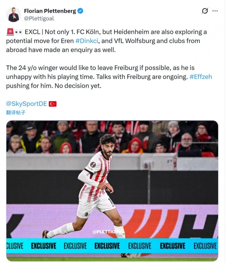 直播吧1月11日讯据德国天空体育报道,科隆、海登海姆、沃尔夫斯堡等队有意弗赖堡边锋丁克希。