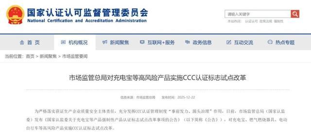 2025年11月,国家市场监管总局(国家认监委)发布相关公告,对充电宝、燃气燃烧器具、电动自行车等共计3类11种高风险产品实施CCC认证标志试点改革。