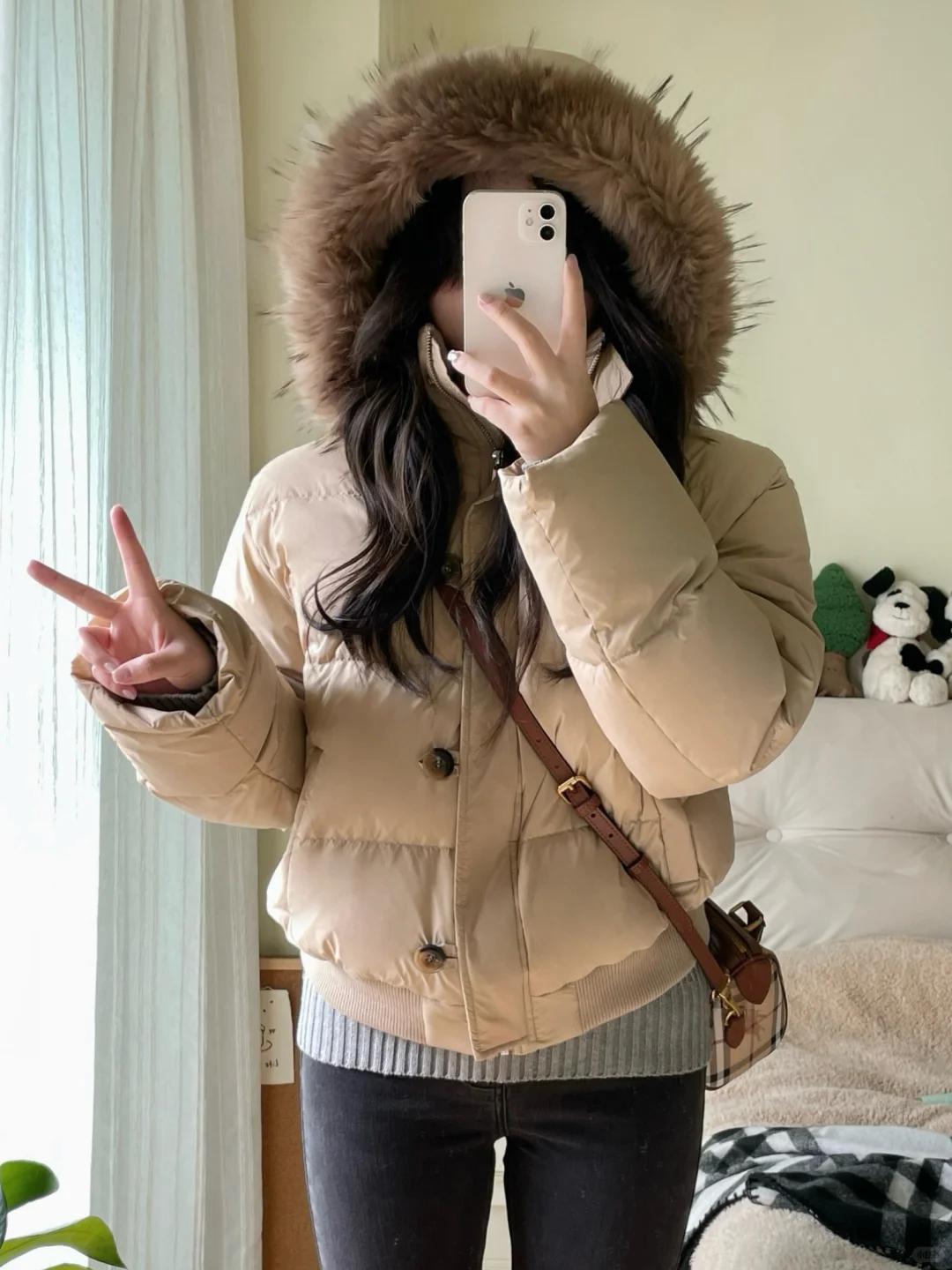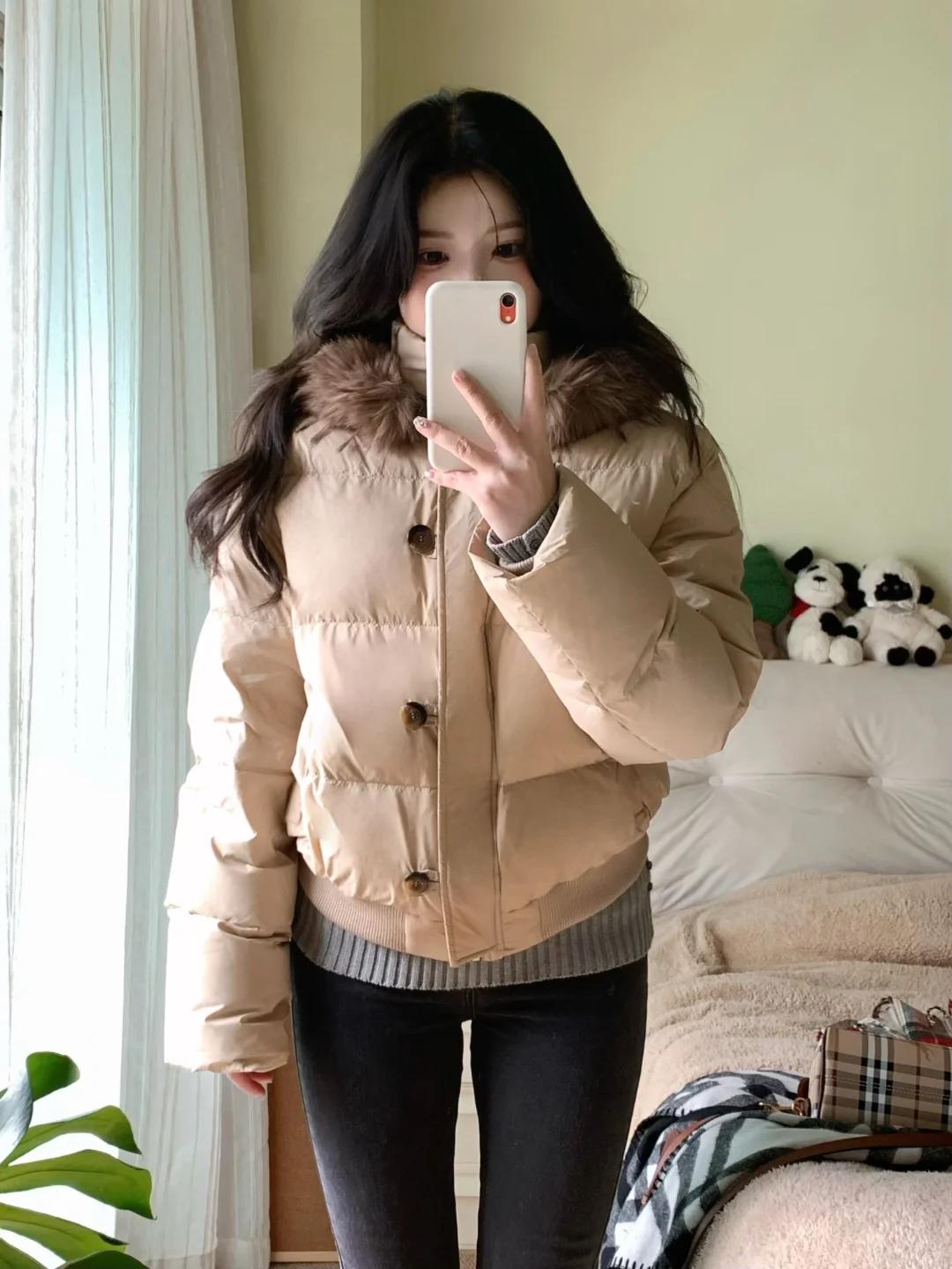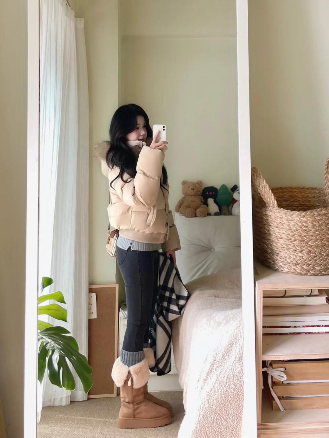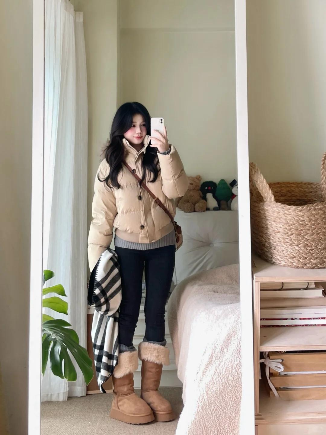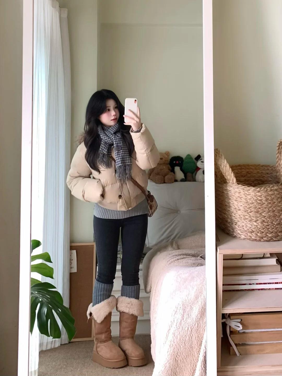 📌【158小个子冬日显瘦公式!卡其+灰+黑=腿长两米】❄️ 怕冷星人必看!短款羽绒服这样穿真的不臃肿!卡其色短羽绒叠穿燕麦灰毛衣,同色系渐变温柔又高级,解开两颗扣子露出内搭下摆,层次感瞬间拉满. ✨ 下半身紧身黑裤塞进驼色雪地靴,上宽下窄的黄金比例,视觉显瘦5斤!灰色毛衣叠穿打造高腰线,非常显身材。 👖 搭配毛线帽和金属项链点缀,保暖又时髦~北方姐妹外面套个长款大衣也超有范儿!这个冬天告别土肥圆,轻松get韩系小姐姐氛围感💃图片来源于博主:不吃饭了_ 小个子穿搭 冬季显瘦