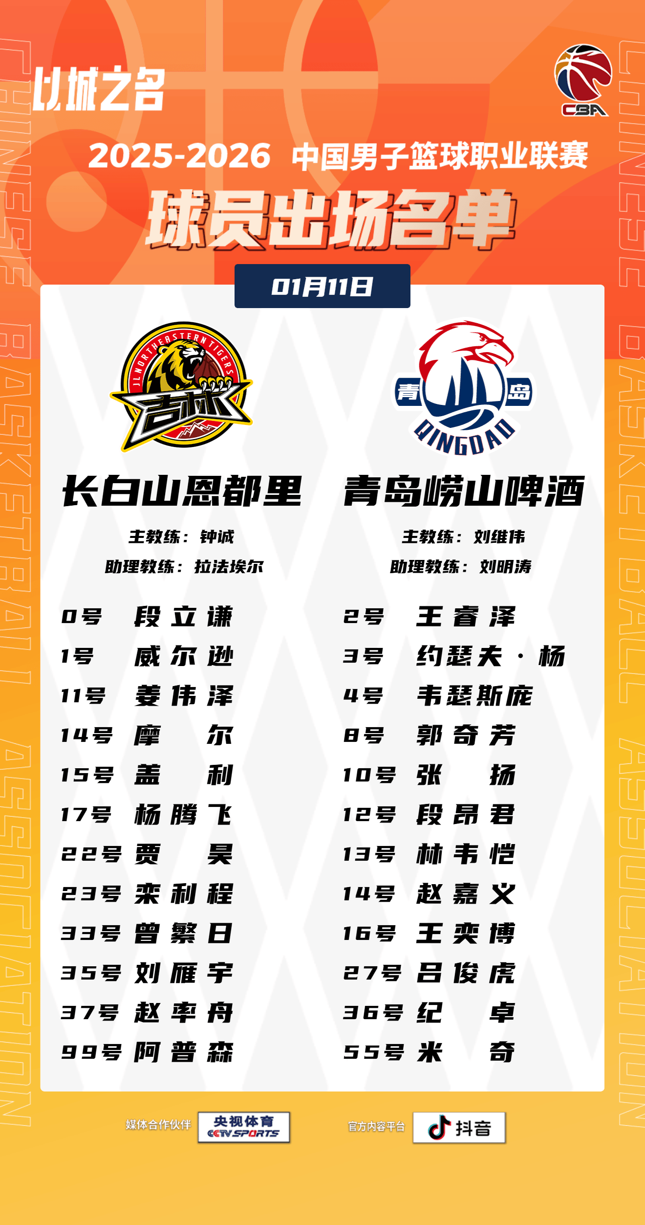 虎扑01月11日讯今晚CBA常规赛,吉林对阵青岛的大名单已经公布。