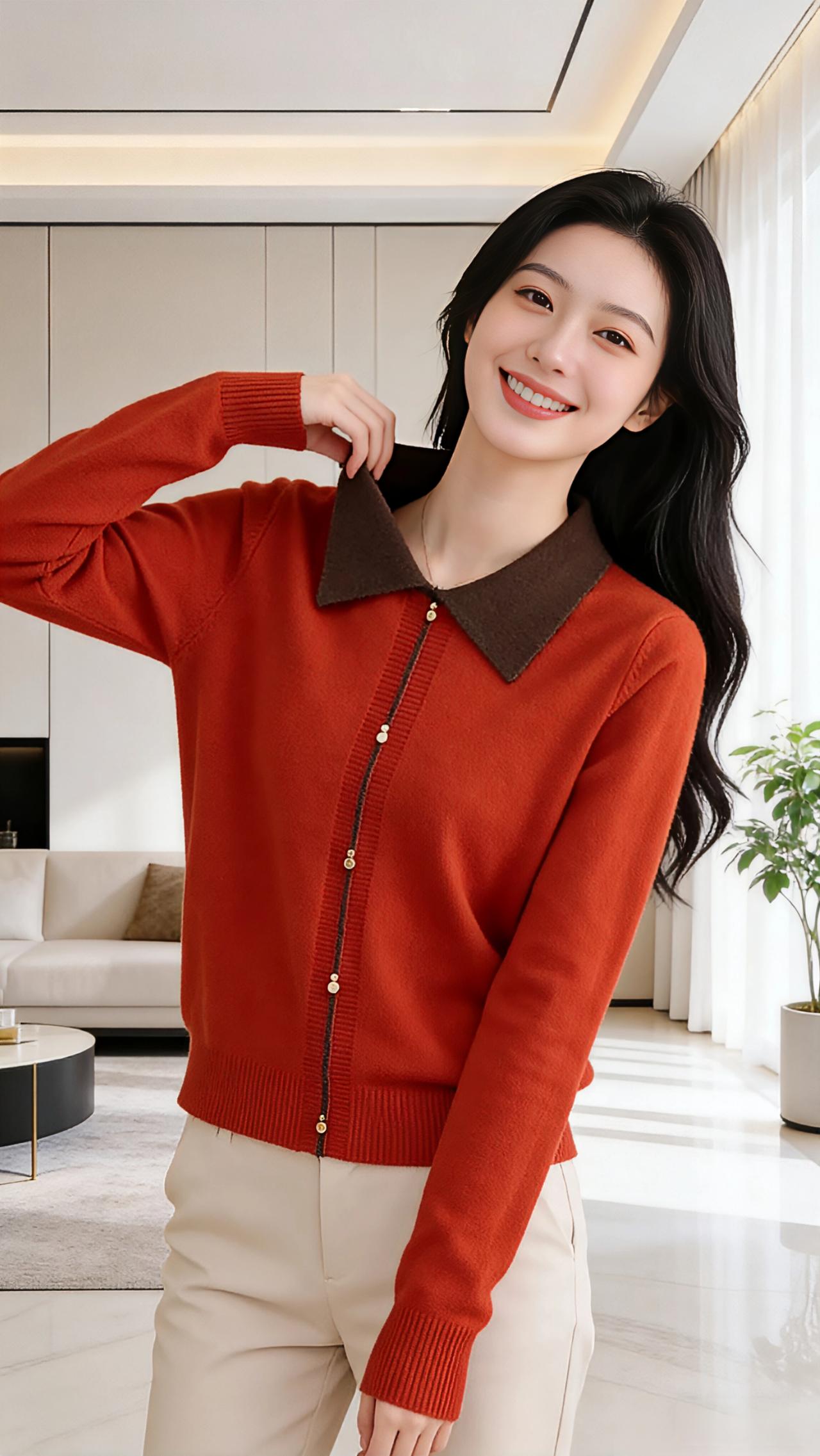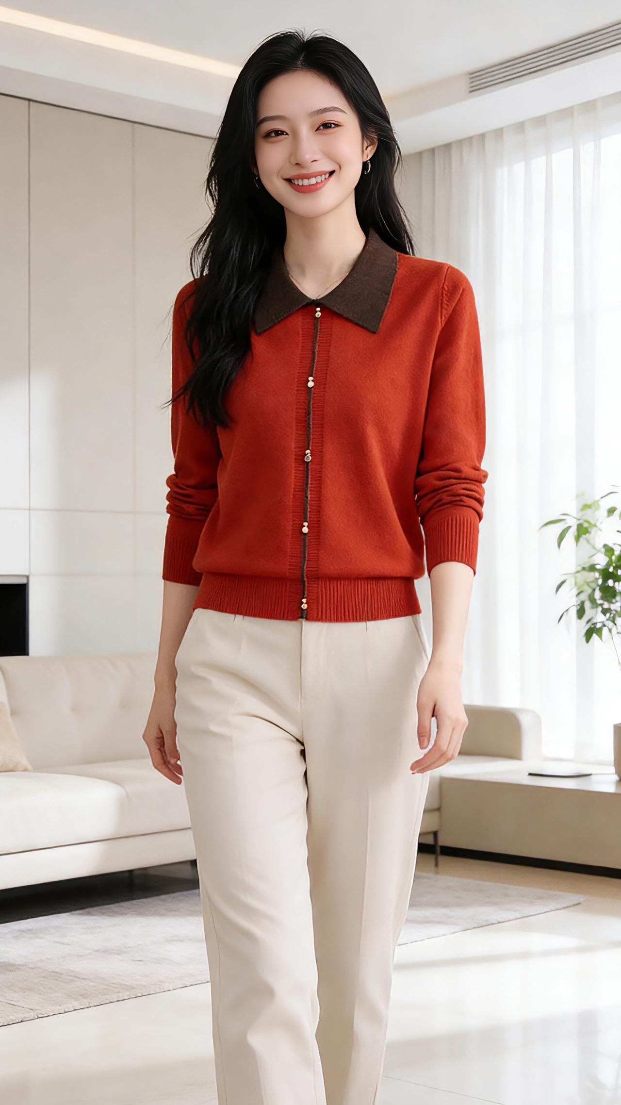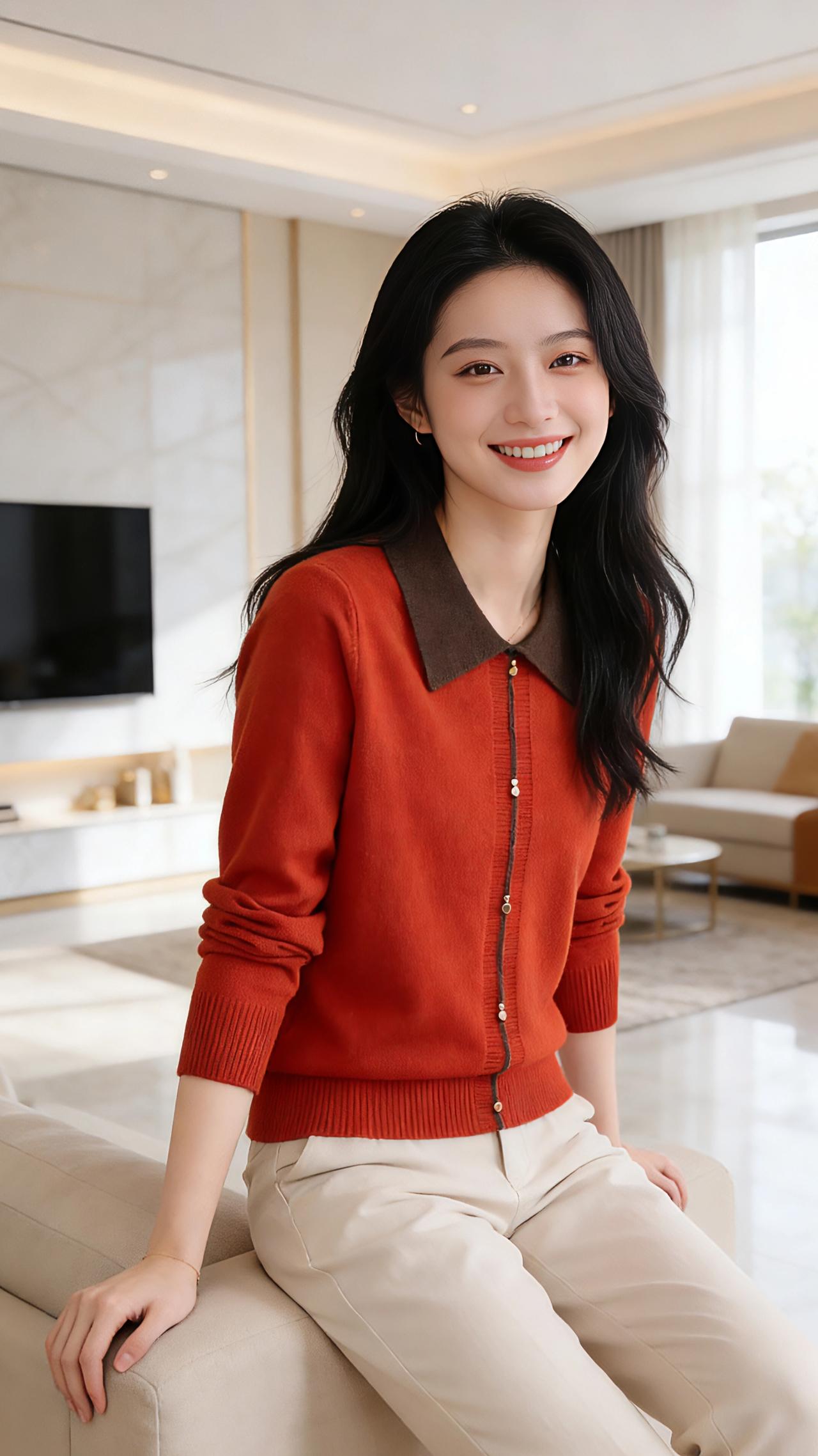 暖橘针织,一室温柔 晨光透过纱帘漫进客厅,在米白色的沙发与光洁的地砖上揉出柔软的光斑,而那抹暖橘色的针织开衫,成了这方空间里最鲜活的注脚。 深棕的翻领撞着橘红的衣身,像焦糖融进了落日,金属拉链的细闪藏在针织的纹理里,添了几分精致的小心思。她抬手轻扯衣领时,针织的软糯肌理贴着肌肤,袖口随意挽起的弧度,让慵懒与利落恰到好处地相融。 米色长裤衬得身形愈发轻盈,行走时衣摆轻轻晃动,橘红的暖调与室内的浅色系相拥,像把秋日的甜暖封存在了房间里。她笑着倚在沙发边,发丝垂落肩头,针织衫的暖意裹着她,也让这寻常的居家时刻,多了几分温柔的诗意。 高级感穿搭 新年穿搭 时尚气质穿搭
