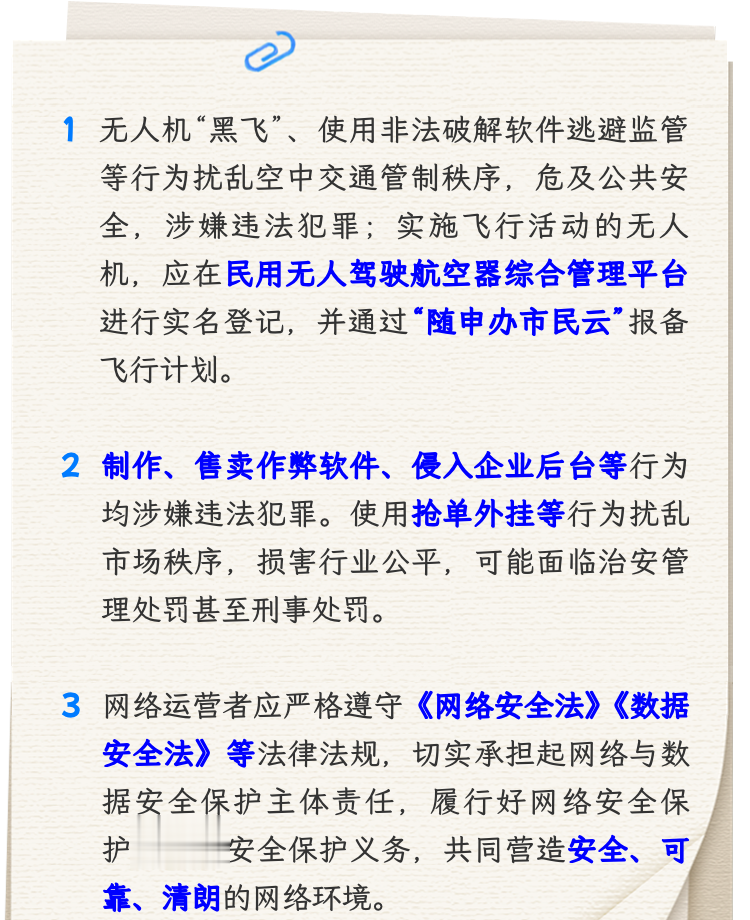 无人机“黑飞”、使用非法破解软件逃避监管等行为扰乱空中交通管制秩序,危及公共安全,涉嫌违法犯罪。实施飞行活动的无人机,应在民用无人驾驶航空器综合管理平台(https://uom.caac.gov.cn/)上进行实名登记,并通过“随申办市民云”(APP、微信小程序、支付宝小程序)报备飞行计划。请广大“飞手”严格遵守飞行报备、高度限制、禁飞区管理等规定,共同维护申城的空域安全。