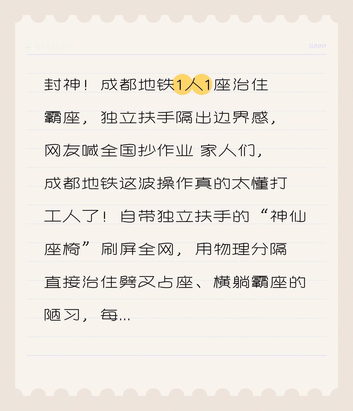 封神!成都地铁1人1座治住霸座,独立扶手隔出边界感,网友喊全国抄作业 家人们