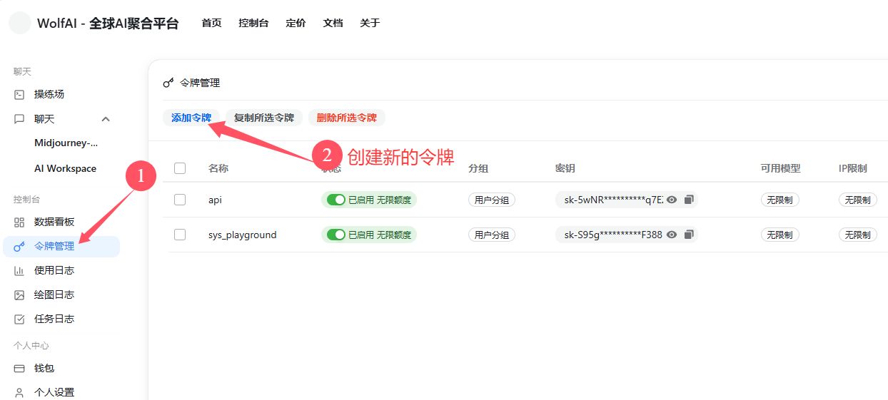 注册后在 API 令牌 页面点击 添加令牌 获得(以 sk- 开头)名称随意,额度建议设为无限额度,有效期选择永不过期
