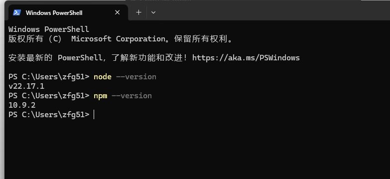 正确安装完成后输入以下命令,打开 PowerShell 窗口输入以下命令,可以查看到 Node.js和 npm 版本号