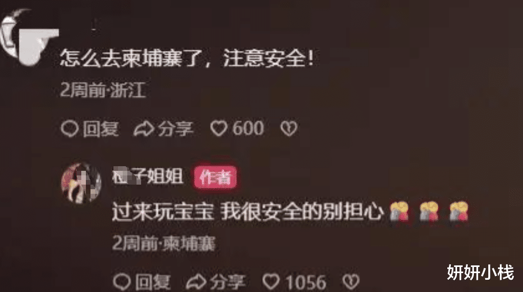 查看其账号,可以见到11日发布了视频,她的定位IP是在柬埔寨,并回复网友她很快会回国。但是,到了12日该网红失联。