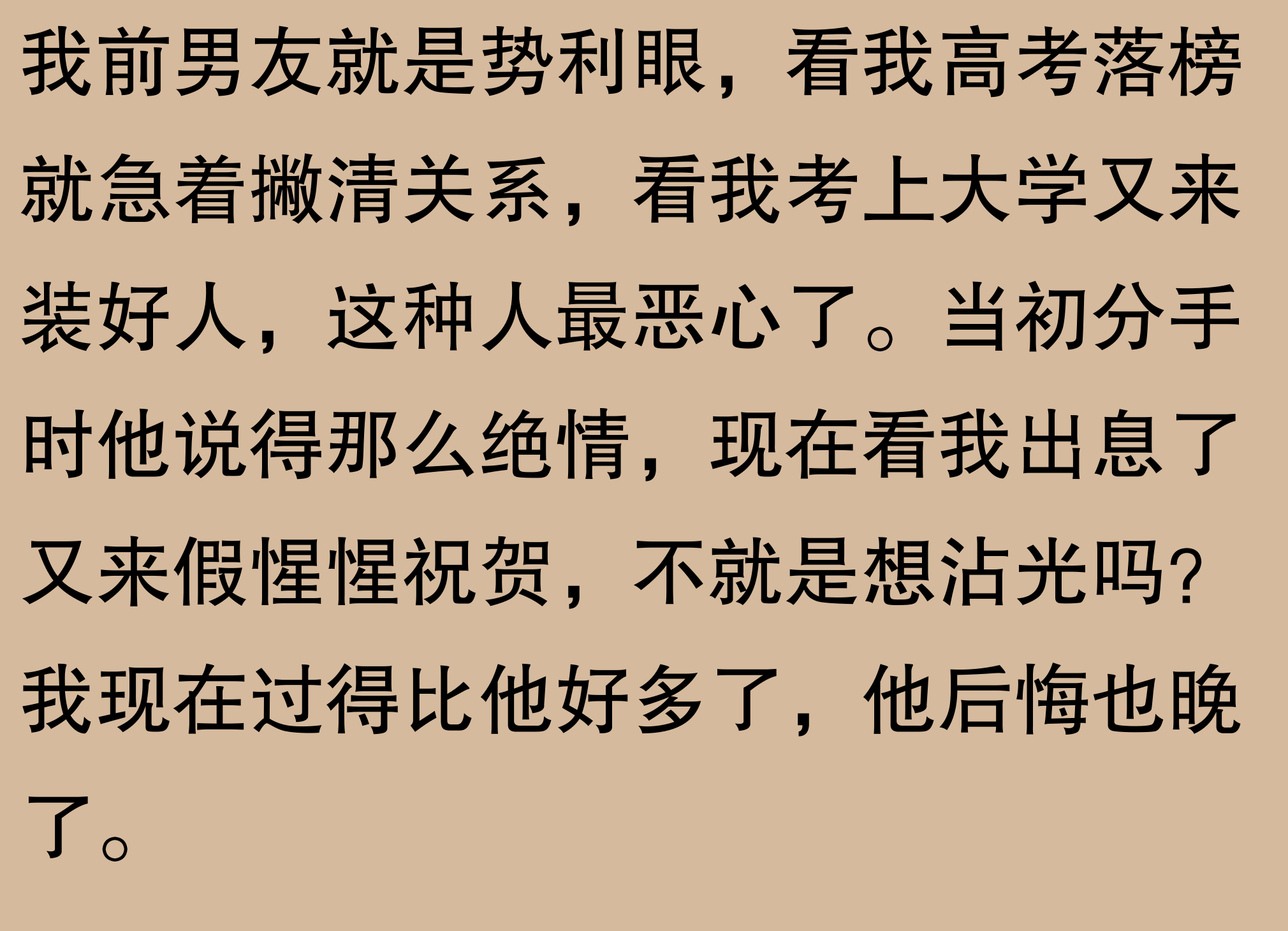 我前男友就是势利眼,看我高考落榜就急着撇清关系,看我考上大学又来装好人,这种人最恶心了。当初分手时他说得那么绝情,现在看我出息了又来假惺惺祝贺,不就是想沾光吗?我现在过得比他好多了,他后悔也晚了。