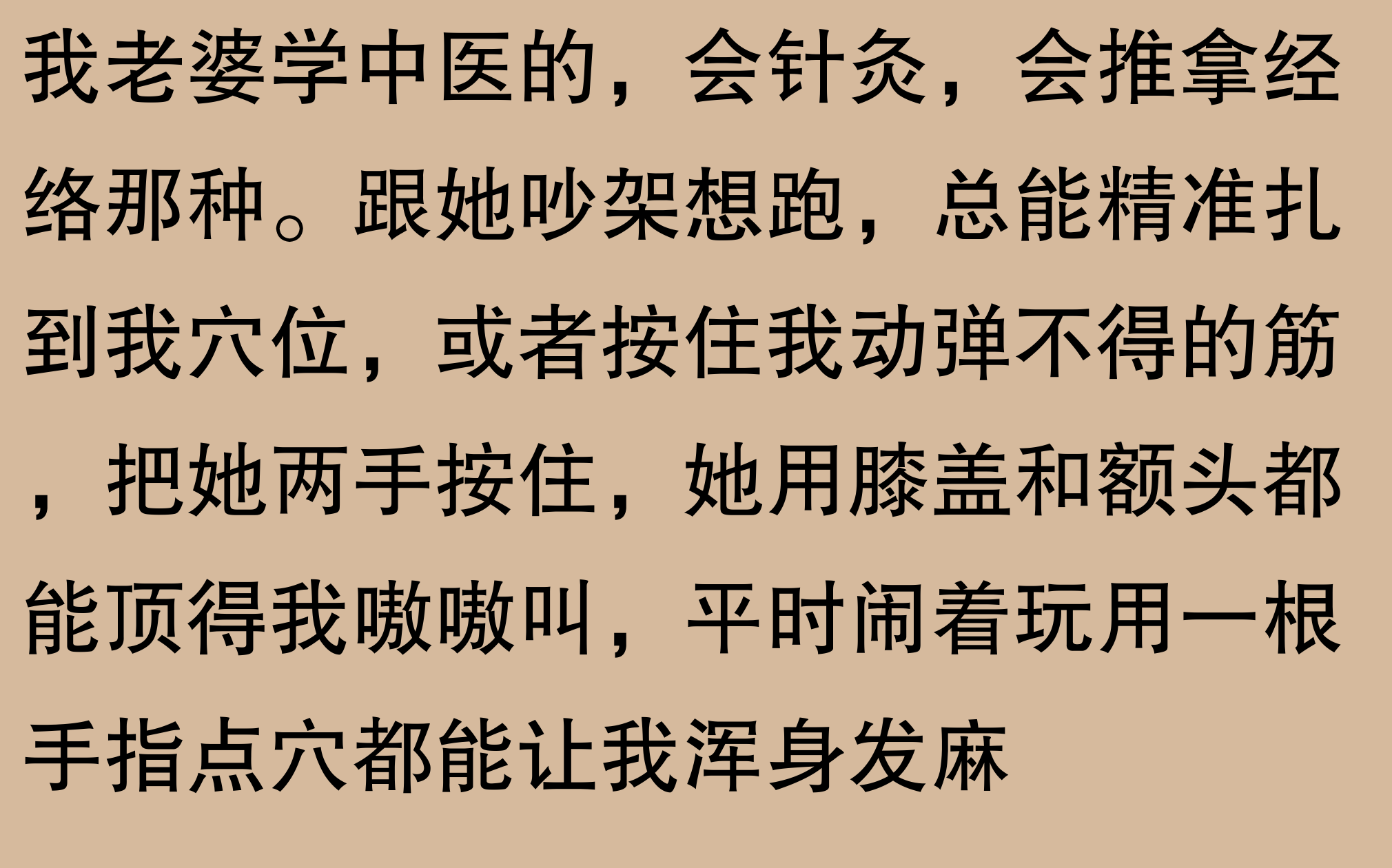 我老婆学中医的,会针灸,会推拿经络那种。跟她吵架想跑,总能精准扎到我穴位,或者按住我动弹不得的筋,把她两手按住,她用膝盖和额头都能顶得我嗷嗷叫,平时闹着玩用一根手指点穴都能让我浑身发麻