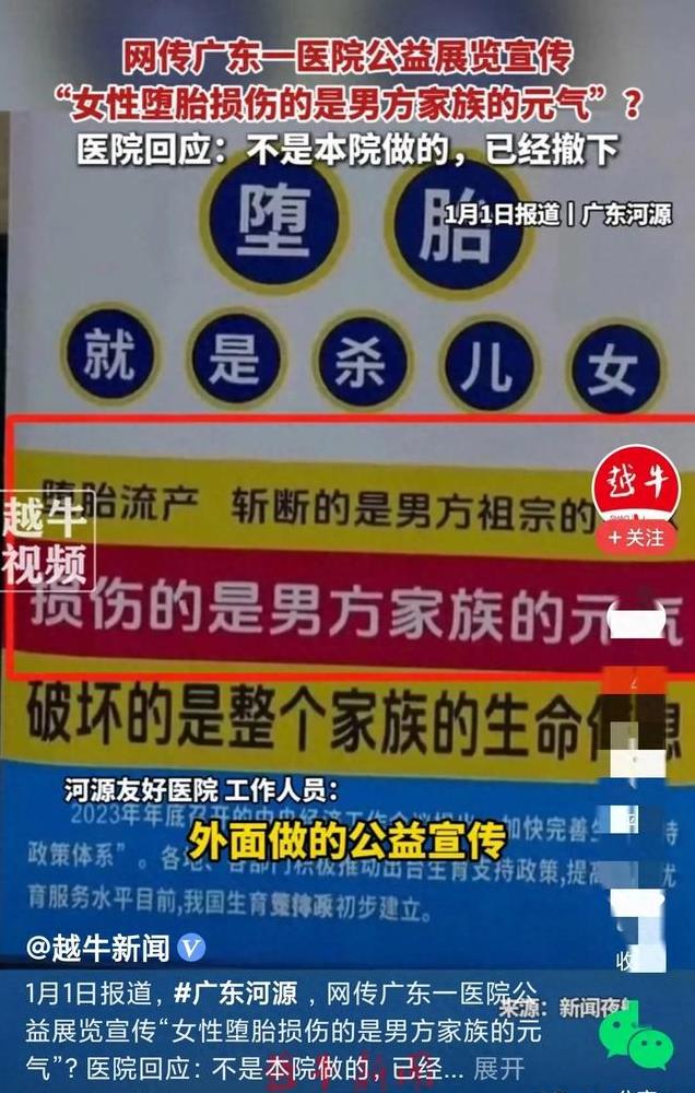 真是怪事年年有,今年特别多,2025年开年第一天广东河源的河源医院火了:网传广东一医院公益展览宣传“女性堕胎损伤的是男方家族的元气”,事件传播到了网络以后立刻引起了社会的广泛关注和热议。