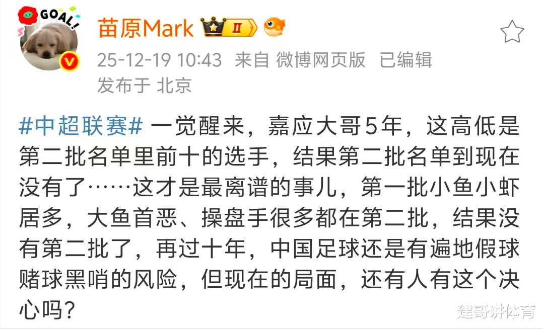 北京时间12月19日,在本赛季的中超联赛落下帷幕后,感觉足协第二批处罚名单也到了该公布的时候,对于足协第二批处罚名单到底都会有谁?记者苗原在个人社交上提前给关注中超处罚名单的球迷爆了一个料,苗原称第一批名单都是小鱼小虾,大鱼首恶、操盘手很多都在第二批,言下之意就是足协第二批处罚名单里面全部都是大佬级别的人物,不过对于足协第二批处罚名单,记者苗原却认为很难公布,从记者苗原的担忧来看,他对第二批处罚名单的公布并没有抱有很大的希望,虽然他知道第二批处罚名单中的大佬是谁,但他还是希望官方能够公布给球迷们。