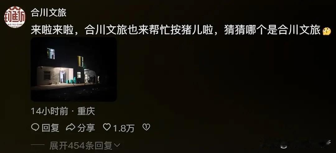不得了了!合川女子喊网友杀猪,结果来了半个中国!文旅凌晨赶来搭伙 就一句“我爸按不住猪,来帮忙的管泡汤饭,想让家门口车比结婚还多”,谁能想到捅了马蜂窝?晚上建的5个500人微信群秒满,第二天一早,村口土路堵得水泄不通,车队从山头排到山脚,比赶集还热闹。 呆呆站在自家院坝里,看着乌泱泱的人,脚都软了——原以为网友们就图个乐,哪成想真有人开几百公里车来“赴约”。可这姑娘实在,愣了几秒就扯开嗓子喊:“来都来了!杀猪!管够!” 俩年猪眨眼间变成刨猪汤,网友们自带碗筷蹲在院坝里吃,有人烧火,有人摘菜,比亲戚聚会还热闹。家里猪不够,呆呆就跑隔壁村买,硬是把宴席撑了下去。 更绝的是,后半夜两点,合川文旅的人裹着寒气来了,没摆架子,蹲在火堆旁跟网友一起搓手,说:“咱一起给全国人民做顿热乎饭!”转天,呆呆就跟着文旅干部拍视频,对着镜头笑:“来合川过年,我请你们吃泡汤饭!” 谁能想到,一句随口的邀约,愣是把个小村庄变成网红地。网友说得逗:“这哪是闯祸,这是给家乡捅了个‘金窝窝’!” 你说,这算不算最接地气的“流量密码”?