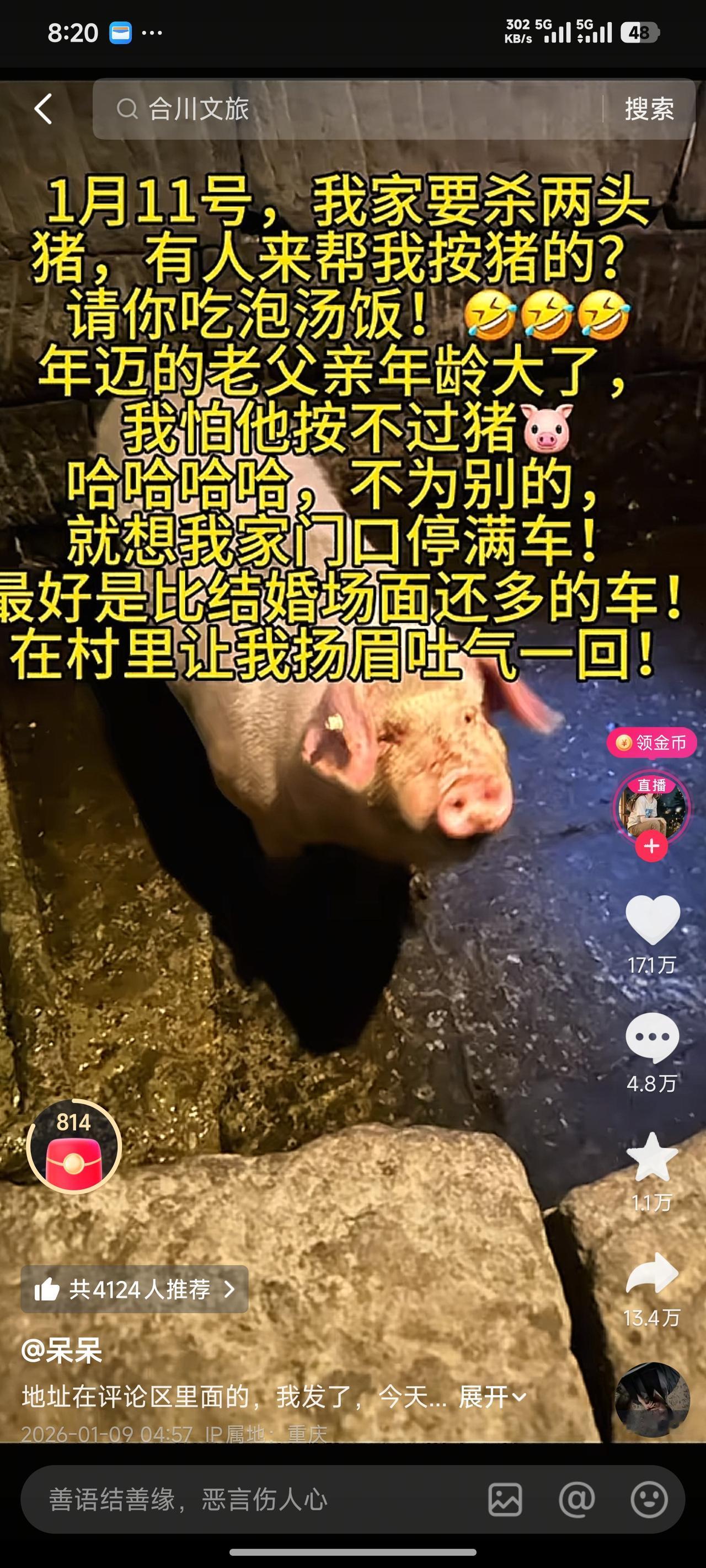 疯了,疯了,一个叫呆呆的博主,家里杀猪,邀请网友去家里面吃杀猪宴,本来就是当朋友圈发了个视频,结果全国各地,四面八方的网友纷纷奔赴。 他当初发的那个视频已经有17万人点赞了,今天晚上的直播,直播间里面也有10万加的人在观看。 现场更是热闹非凡,院子中间点起了篝火,篝火周围围满了四面八方奔来的网友。 网友像走亲戚一样,带着礼物上门。博主家原本是想杀两头猪的,现在根本就不够。 合川文旅看到这破天的流量。果断接得稳稳当当。又送来了五头猪。 现在的视频真的是火得莫名其妙,上一次有一个偷甘蔗的火了一把,现在又到杀猪宴了。 视频就是这样,哪里有流量,哪里就有博主跟风。于是风借火势火借风势就火得一塌糊涂。