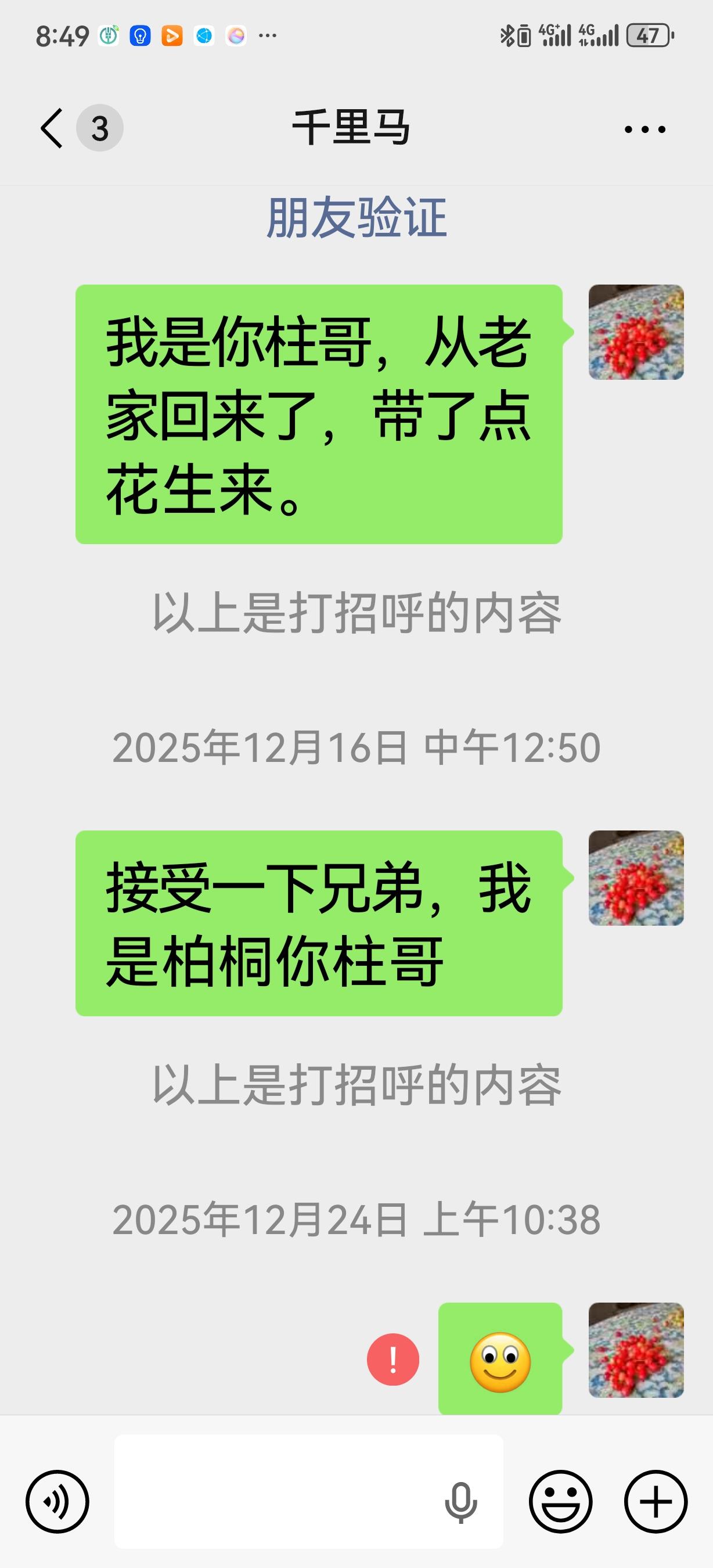 通过抖音,2024年我在北京认识了一位河间老乡,他生活工作都在北京,而且我们是一个乡的。 这位老乡非常热情,邀请我吃了饭还加了微信,分别的时候他说想吃点老家的花生。 不巧的是那年阴历9月廿八,我老娘去世了,一年多都没心情拍视频,也和老乡断了联系,却没忘记花生的事。 今年秋后,我特意买了200块钱的水果花生,给老乡留了两兜,这次来北京带了过来。 可微信联系上,多次加好友留言、抖音私信都没得到回复,我知道,老乡怕是误会我把他忘记了。 可能老乡还没看到我的留言和私信。 在北京能认识一个老乡真的不容易,我是一个重情义的人,没忘记我们同乡的那份情意,我也非常珍惜这份情意。 我也知道你也是一个重情义的人,要不然也不会请我吃饭。 因为这件事,我心里总是感觉沉甸甸的。 我非常期待老乡能早点看到我的留言,能了却了我的心愿。