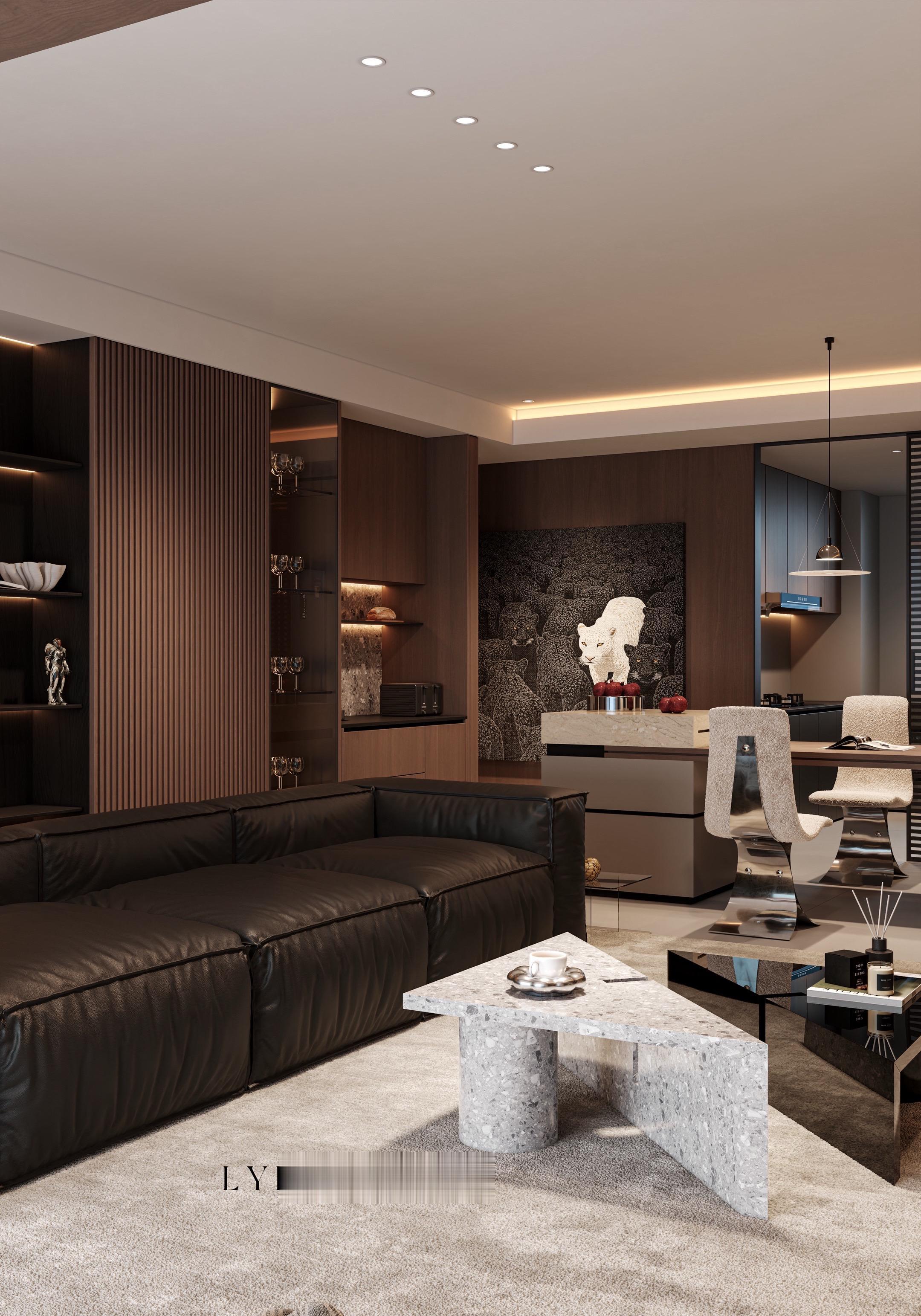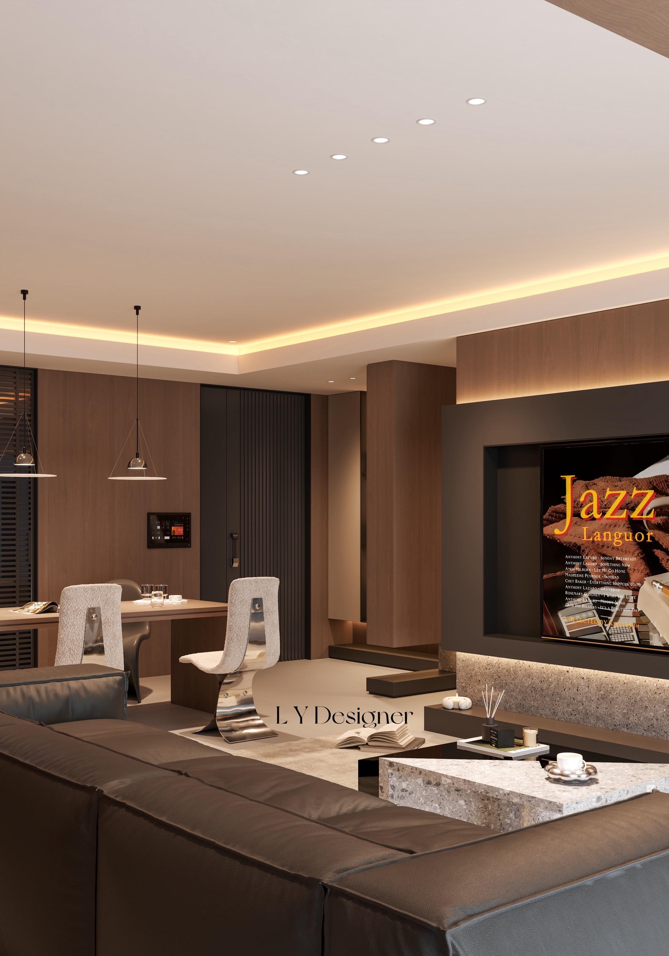 • 𝑳𝒀 𝑫𝑬𝑺𝑰𝑮𝑵 100平 宁波设计 精装房改造 空间布局与动线 🛋采用开放式布局,电视背景墙与沙发区形成对称视觉,动线流畅。电视墙设计为嵌入式,搭配落地式台面,既节省空间又提升层次感。 色彩与材质搭配 🏻主色调为中性色系:深灰、木、米白,营造沉稳静谧的氛围。电视墙采用深色木饰面+石材拼接搭配暖色灯带,突出质感。茶几与边几选用大理石与金属结合,提升轻奢感。 灯光设计 💡隐藏式灯带+吊灯+局部射灯组合,实现"无主灯"照明,光线柔和且富有层次,尤其电视墙上方的灯带,有效拉伸空间高度