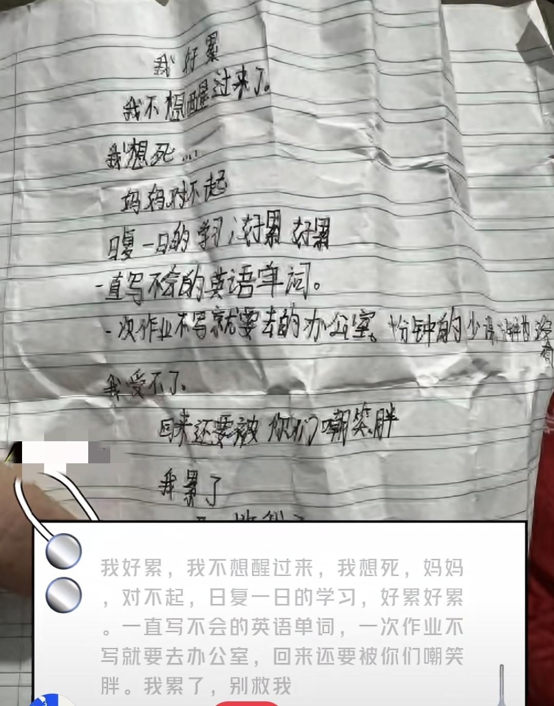 这新闻看得我心颤抖💔 才12岁的小姑娘,会服药自杀! 还留了遗书【写不会英语单词】 这心里有多累!多绝望[叹气] 沟通的最大问题在于 人们觉得已经沟通过了[融化] 父母离异,长期住在外婆家 在学校有些不愉快, 让这个懵懂的女生无处安放自己内心! 压死骆驼的不是最后根稻草啊[伤心] 非要追究责任的话,也是很难界定的! 父母肯定过不去这个坎 但悲剧的结果是不可逆的! 也许她想证明自己,想让自己优秀 让自己受到更多的重视和关怀! 没有人告诉她,你本身就很好 你分数不高也不影响对你的喜爱! 大概没人这么告诉过她吧! 这个孩子内心是很孤独的 这个遗书我看了好几遍 懵懂的孩子甚至还不明白生死的份量 就像一片云,消失得无影无踪[祈祷][祈祷]
