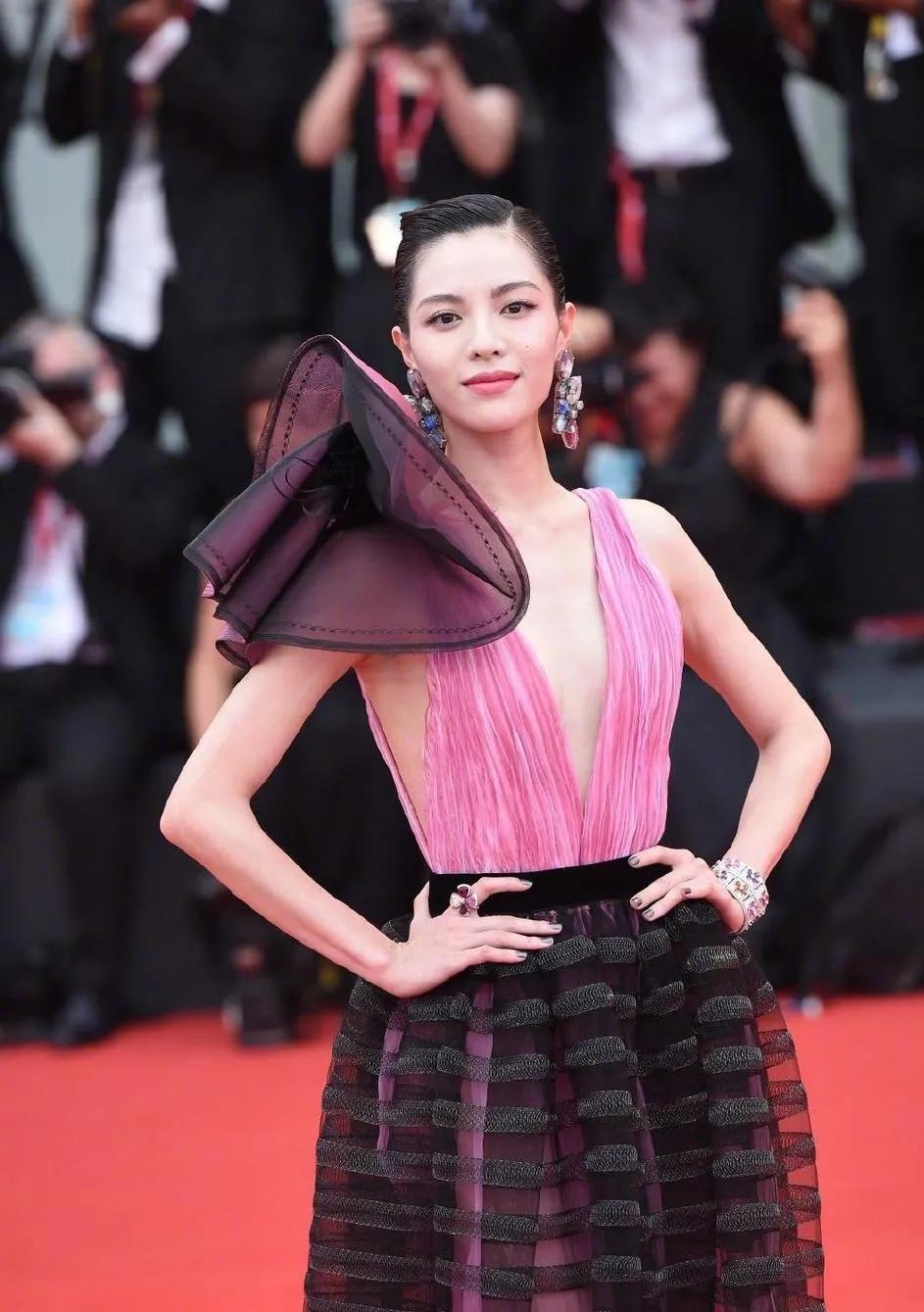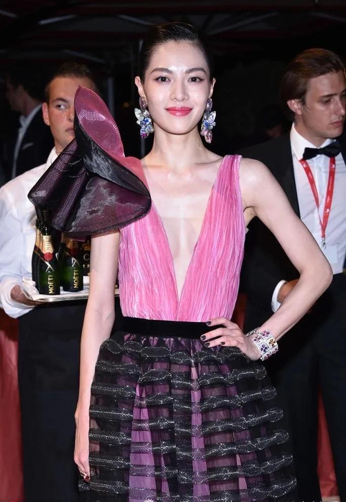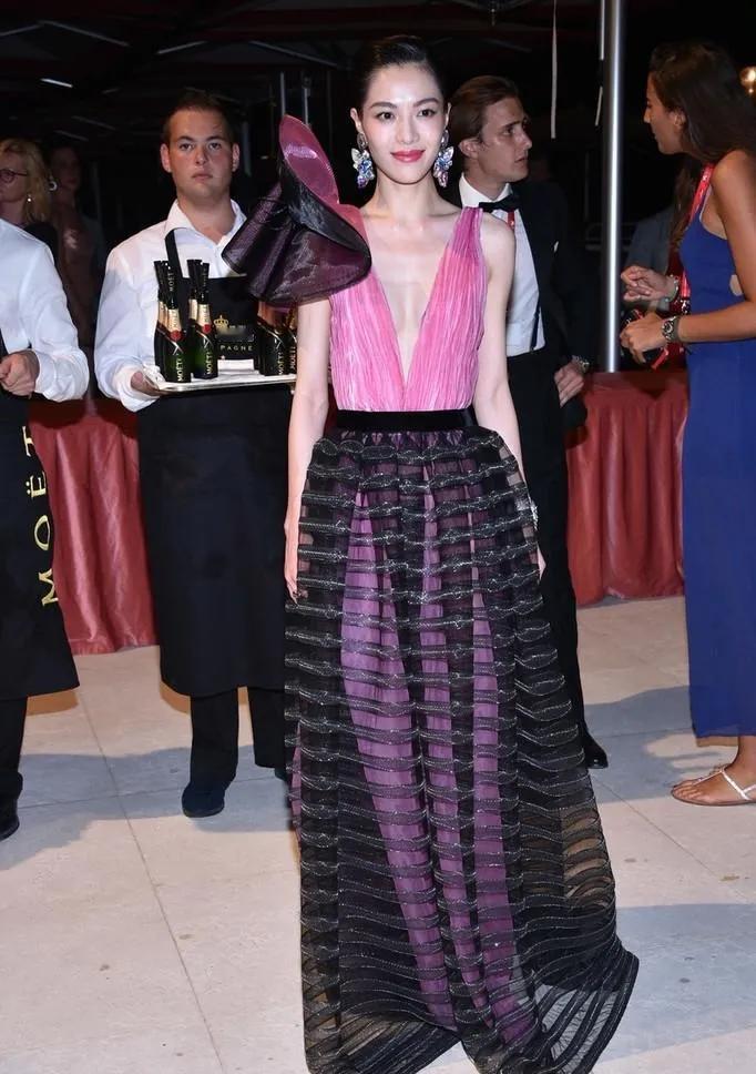 刘雯把高定穿成了自己的秀场! 一袭粉紫拼接的深V礼服,完美勾勒出她的超模身材