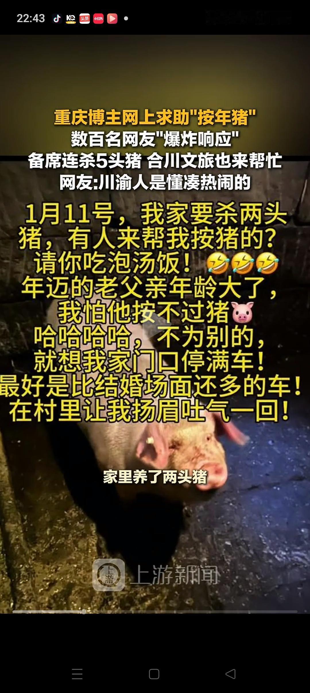 没事可别上网许愿,因为它真可能超额实现![捂脸] 重庆女生呆呆,因为爸爸年纪大了,怕按不住猪,想求助几个网友来帮忙,顺便请吃刨猪汤。 万万没想到的是,结果来了几百人一起吃席。车子从村头到了村尾,比结婚还热闹! 要说这帮人,也够意思!基本上没有人空着手来,都是人手一箱牛奶,或者一份礼品,带点菜啥的。 有的直接上手了,从杀猪,到做菜,一直忙着不休息,好像到了自己家一样。 之所以这样,更深层原因是唤醒了大家心里久违的乡村烟火气,想图个热热闹闹的年味。 这样说来就来的聚会,充满了欢声笑语,更充满了朝气,看着还真有点温暖[玫瑰][玫瑰]