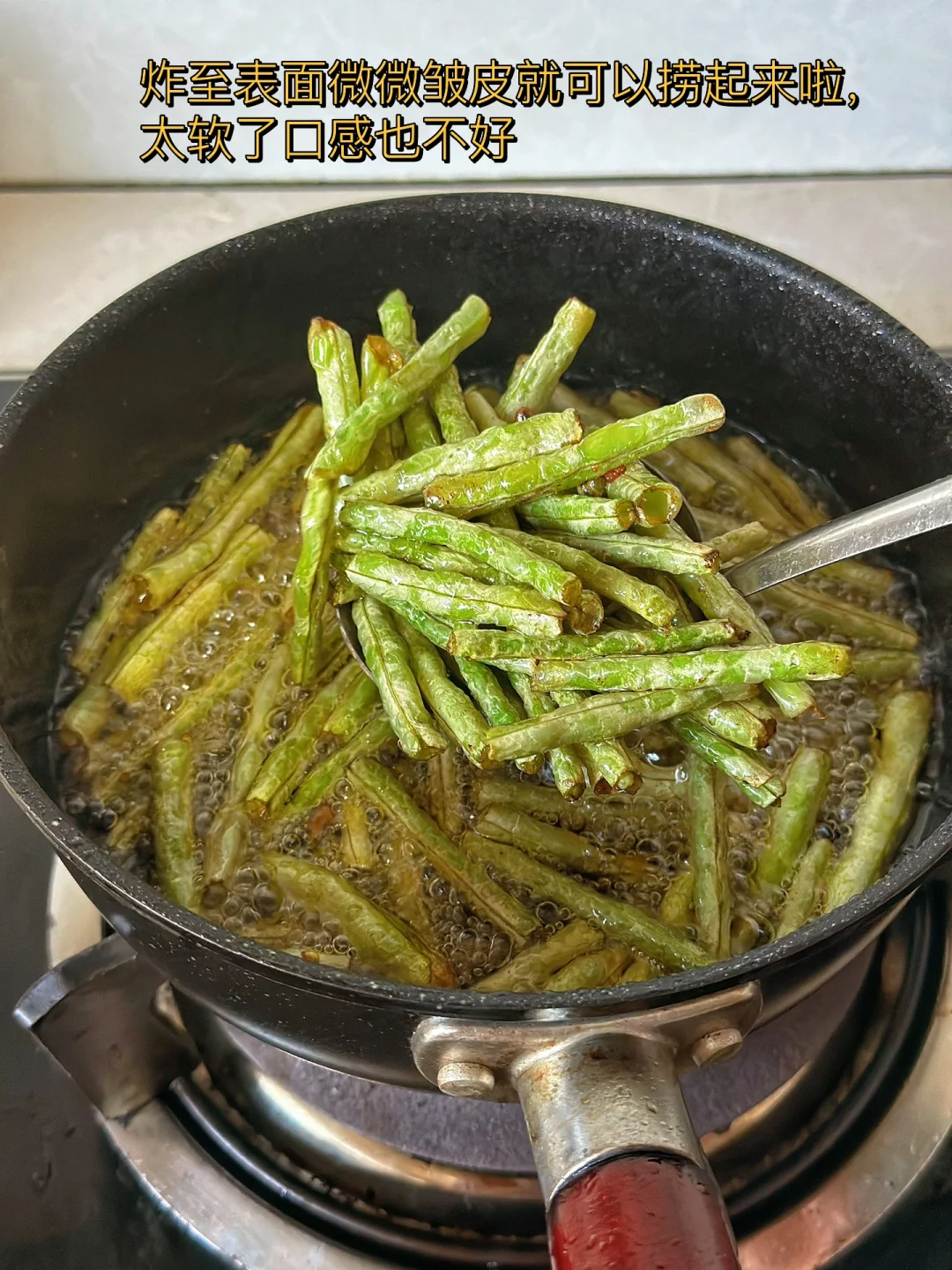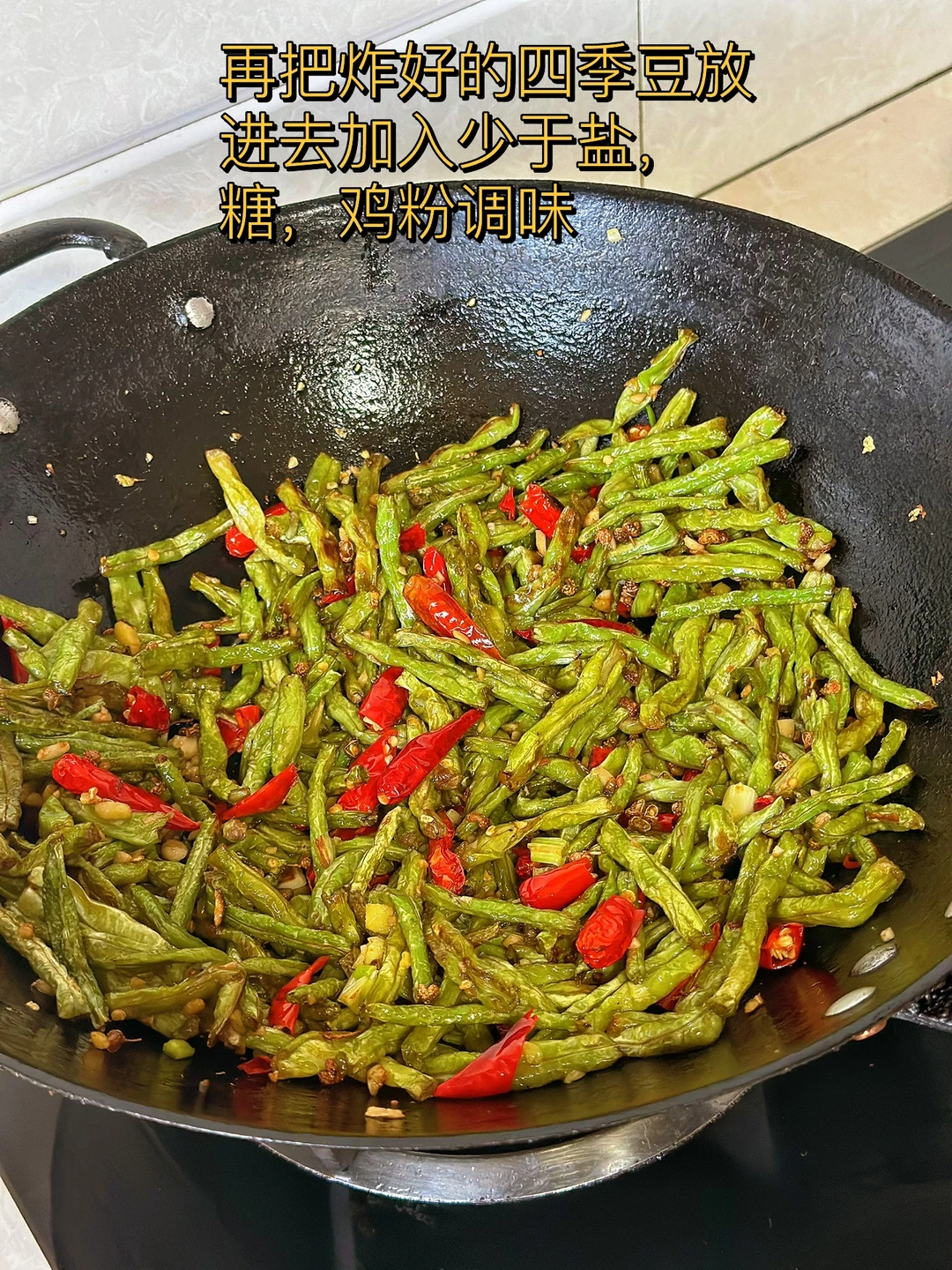 6. 再把炸好的四季豆放进去加入少于盐,糖,鸡粉调味