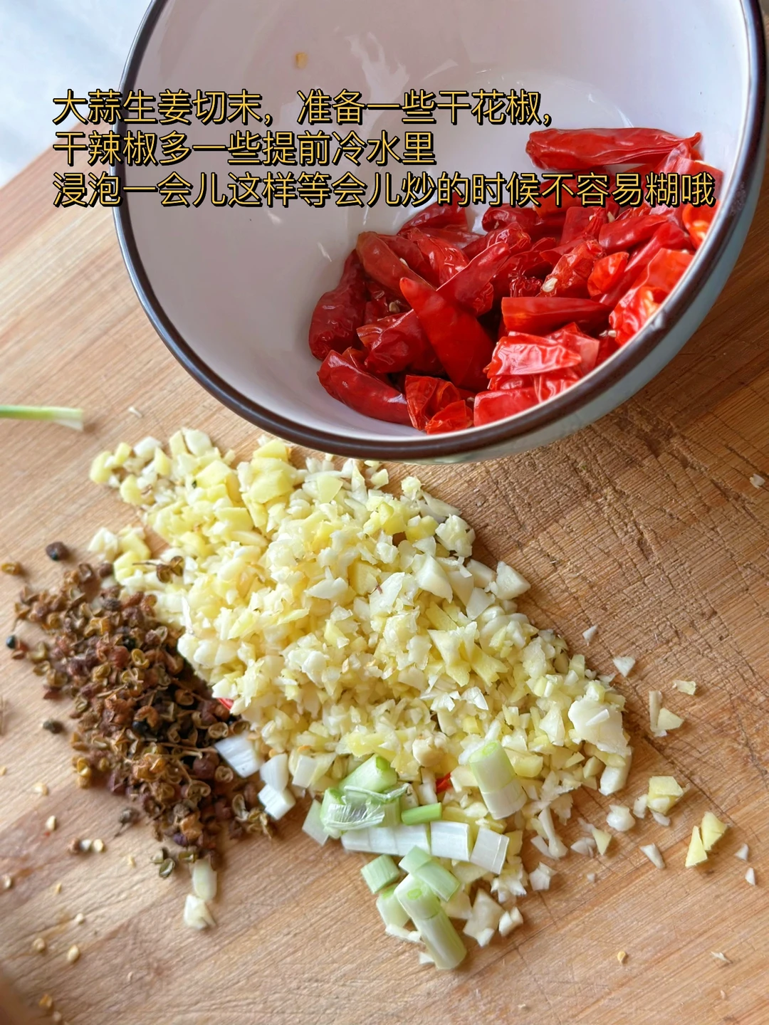 4. 大蒜生姜切末,准备一些干花椒,干辣椒多一些提前冷水里浸泡一会儿这样等会儿炒的时候不容易糊哦