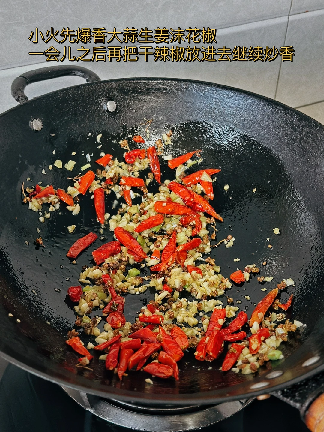 5. 小火先爆香大蒜生姜沫花椒一会儿之后再把干辣椒放进去继续炒香