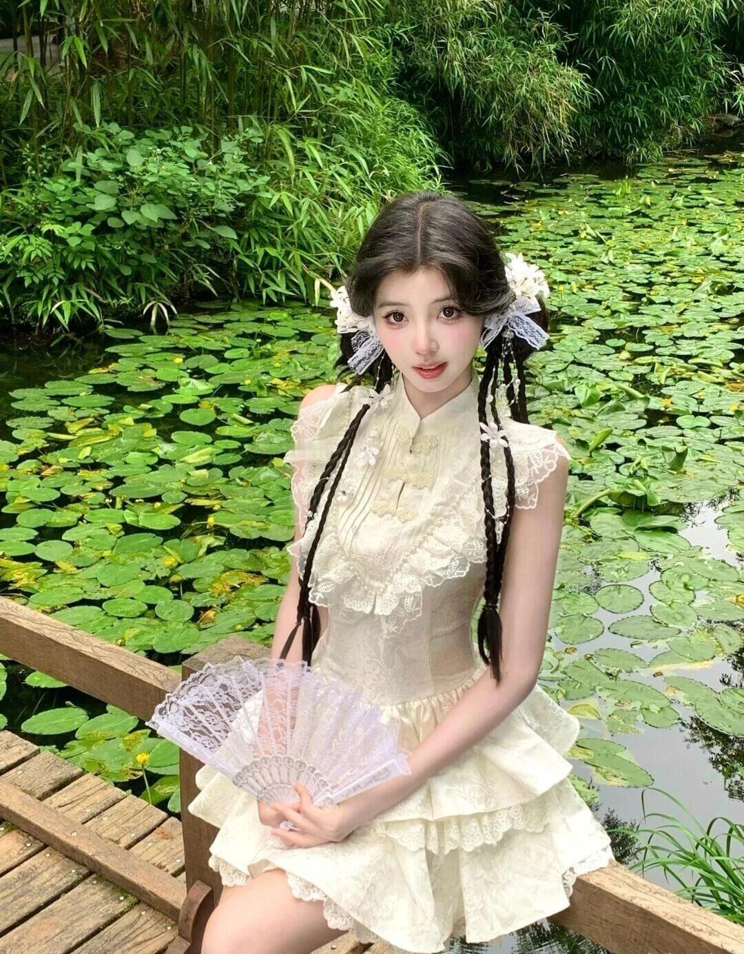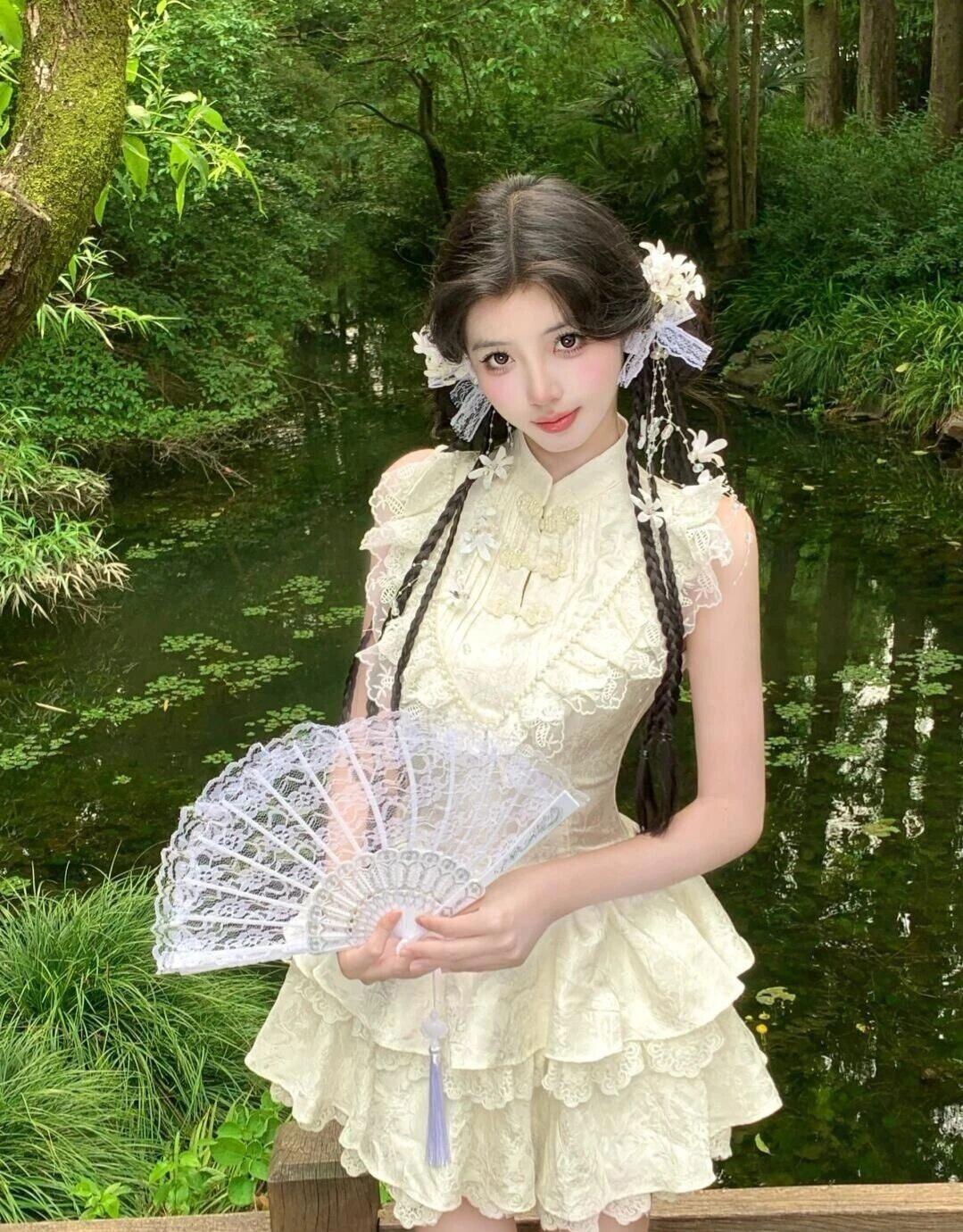 冬日生活打卡季你身着一袭如月光织就的华服,立于绿意盎然的林间水畔,仿佛从古画中走出的仙子。那层层叠叠的裙摆,宛如云朵轻柔地拥抱着大地,每一处蕾丝都闪烁着精致的光芒。双辫垂落,点缀着洁白的花朵,如同夜空中最亮的星辰,映衬出你无与伦比的清丽容颜。背景中的树木葱郁,水面倒映着你的倩影,整个画面宛如仙境般梦幻迷人,令人不禁为之倾倒,赞叹不已。