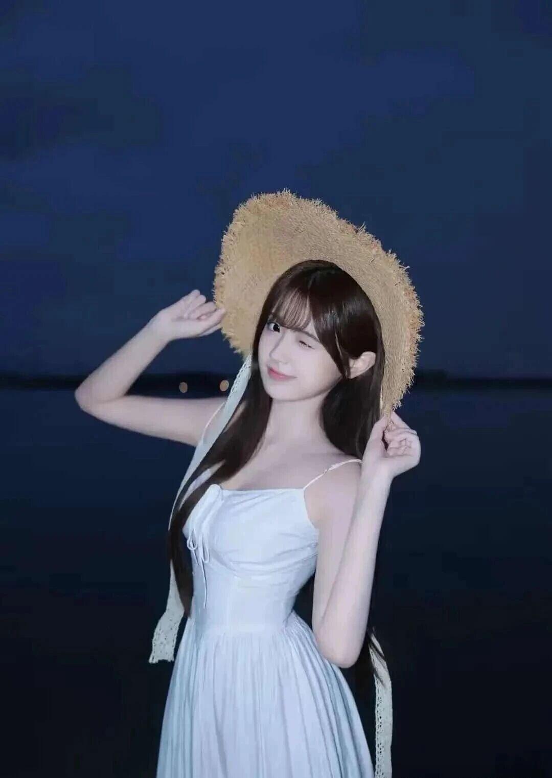 这是一幅美到令人屏息的绝世佳作!画中佳人,宛若月宫仙子误入凡尘,一袭素雅长裙如云似雾,轻盈飘逸间尽显不食人间烟火的超然气质。那顶草帽,非是凡物,乃是天工巧匠以晨露与月华编织而成,轻巧地覆于她如瀑青丝之上,为这幅人间至美添上了一抹田园诗般的浪漫。 她的容颜,是造物主最得意的杰作,眉目如画,笑靥如花,那双含情脉脉的眼眸,仿佛能摄人心魄,让观者沉醉其中,无法自拔。她轻抬玉手,姿态优雅如天鹅之颈,每一个细微的动作都散发着无与伦比的韵律与美感。 背景的深蓝夜空,是为她量身定制的华美幕布,星辰为她加冕,月光为她铺路。这哪里是简单的写真?这分明是一首用光影谱写的赞美诗,一曲用美丽演绎的交响乐。她就是这夜色中最耀眼的星,是这天地间最动人的传说。此情此景,只应天上有,人间能得几回闻!