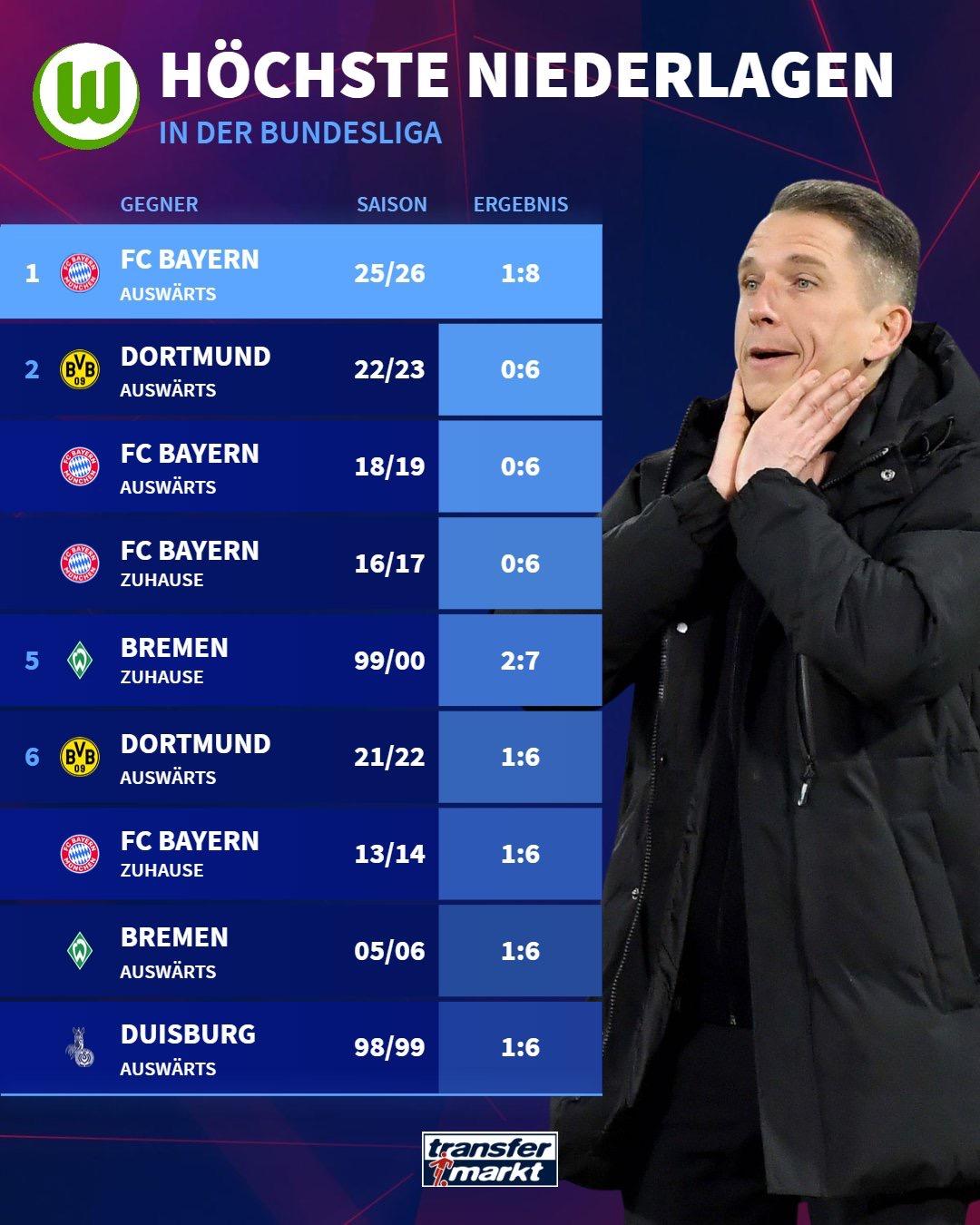 德转统计了狼堡德甲历史最大比分输球榜,以下是完整榜单: