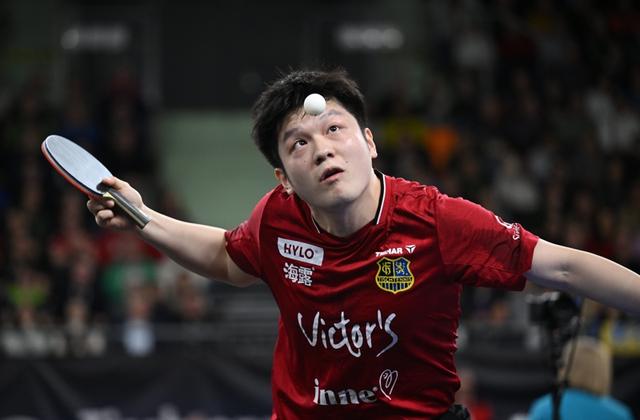 新华社照片,新乌尔姆(德国),2026年1月4日1月4日,萨尔布吕肯队选手樊振东在男子单打比赛中发球。最终他3比1战胜奥克森豪森队选手阿比奥登。当日,在德国新乌尔姆举办的乒乓球德国杯半决赛中,樊振东所在的萨尔布吕肯队3比1战胜奥克森豪森队,晋级决赛。新华社发(乌尔里希·胡夫纳格尔摄)