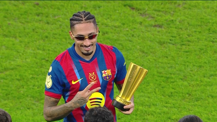 当之无愧!拉菲尼亚当选西超杯决赛MVP,带着炫酷墨镜领取奖杯