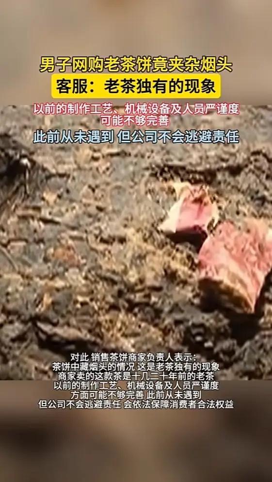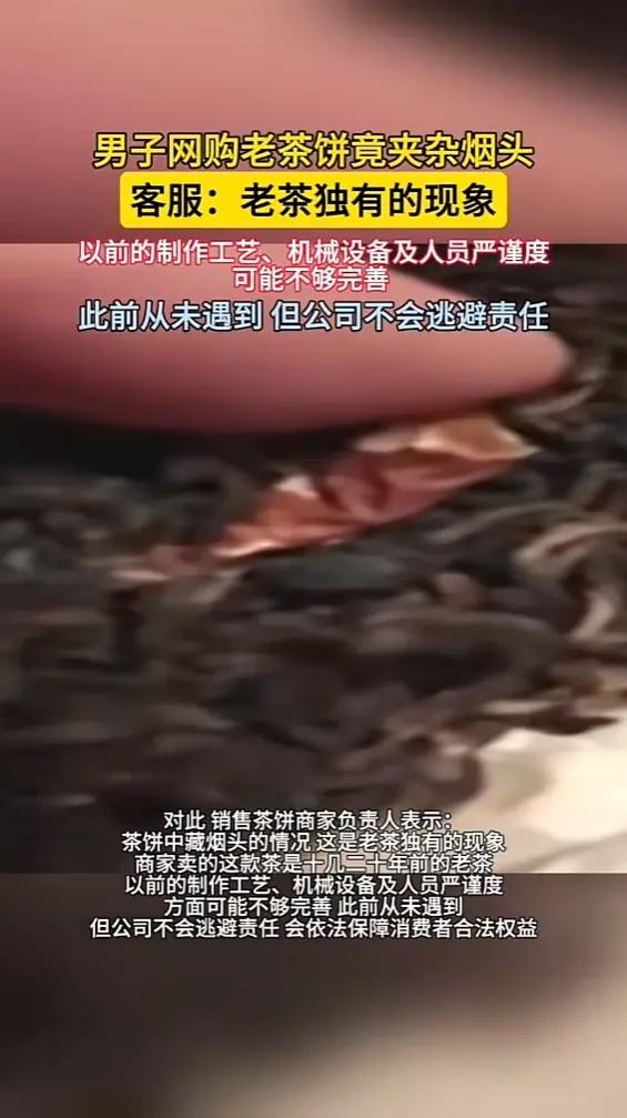 “顾客天塌了!”近日,广东肇庆,一男子拆开两年前买的茶饼时,发现里面竟藏着一根吸剩的烟头!这让男子非常恶心,觉得别人吸过的,上面肯定还沾着口水,结果质问客服时,对方却称这是老茶独有现象,代表这茶饼货真价实!网友:说这话笑了没! 住在肇庆四会的阿华(化名),平时就好喝口茶。2023年年底,他在一个挺火的直播间,一口气买了九饼普洱茶。茶饼收到后,他一直没舍得拆,就放在柜子里存着。 去年秋天阿华想着该尝尝了,便拆开其中一饼,外层的棉纸刚剥开,茶饼中间赫然嵌着个香烟过滤嘴。阿华心里别提多膈应了,这烟头被谁叼过?上面沾着陌生人的口水,想想就一阵反胃。他马上找出手机,联系当初卖茶的商家客服。 客服听完回复说:“哦,这是老茶独有的现象,说明咱们这茶饼是货真价实的老茶。”对方解释这茶是十几二十年前压制的,那时候作坊里条件简陋,工人一边制茶一边抽烟,不小心掉进去也在所难免。 “烟头能和几片茶叶梗一样吗?”阿华火了,这根本不是一回事。他坚持认为这是严重的卫生问题,要求按相关规定退一赔十,算下来差不多六千多块钱。商家不同意,双方来回扯皮了好几次都没谈拢。 在普洱老茶的圈子里,确实流传一种说法,认为年代久远的茶饼,里面有点“特别的东西”不稀奇。早年的制茶作坊,多是手工操作,竹篾铺地,烟头、头发甚至小石子混进原料里,是有可能发生的。 但后续的精制和压饼的工序,都应该把这些杂质筛除干净,一块成品里出现完整的烟头,无论如何都不能用“老茶特征”来搪塞过去。 商家那句“代表货真价实”,听起来更像是一种狡辩。老茶的价值,在于岁月转化出的醇厚风味,而不在于里面封存了哪位老师的“个人纪念品”。把明显的卫生瑕疵美化成品质证明,实在有些荒唐。 拆开老茶饼,尤其是那些来历说明比较模糊的“陈年茶”时,别光顾着闻香,先仔细里外检查一遍。喝茶本是件雅事,谁也不想喝出什么意想不到的“加料”。 各位读者你们怎么看?欢迎在评论区讨论。