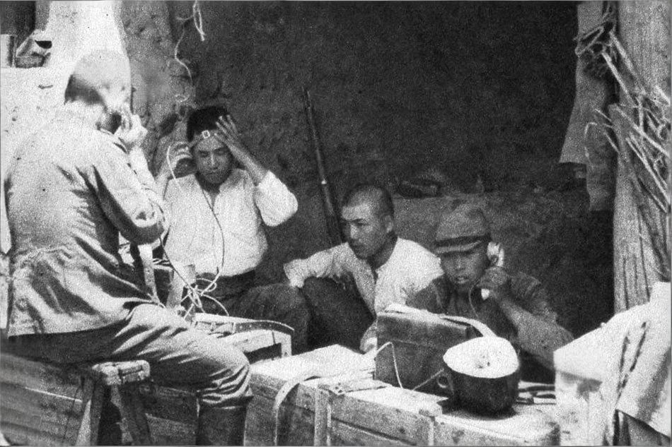 1937年7月,卢沟桥事变爆发后,日军通讯班在简陋掩体里的真实瞬间。狭窄的土洞掩体,墙壁粗糙潮湿,入口用树枝、草帘简单遮挡。洞内光线昏暗,仅靠外部自然光与少量灯具照明,地上铺着木板或草席作为临时操作台。 最左侧日军士兵手持听筒,正在通话,姿态专注。中间两人戴耳机,一人手扶头部,可能在调整频率或集中收听,另一人操作无线电台。右侧鬼子也戴耳机,旁边堆放步枪、弹药包、饭盒等,这个应该是用于团级以上指挥联络。