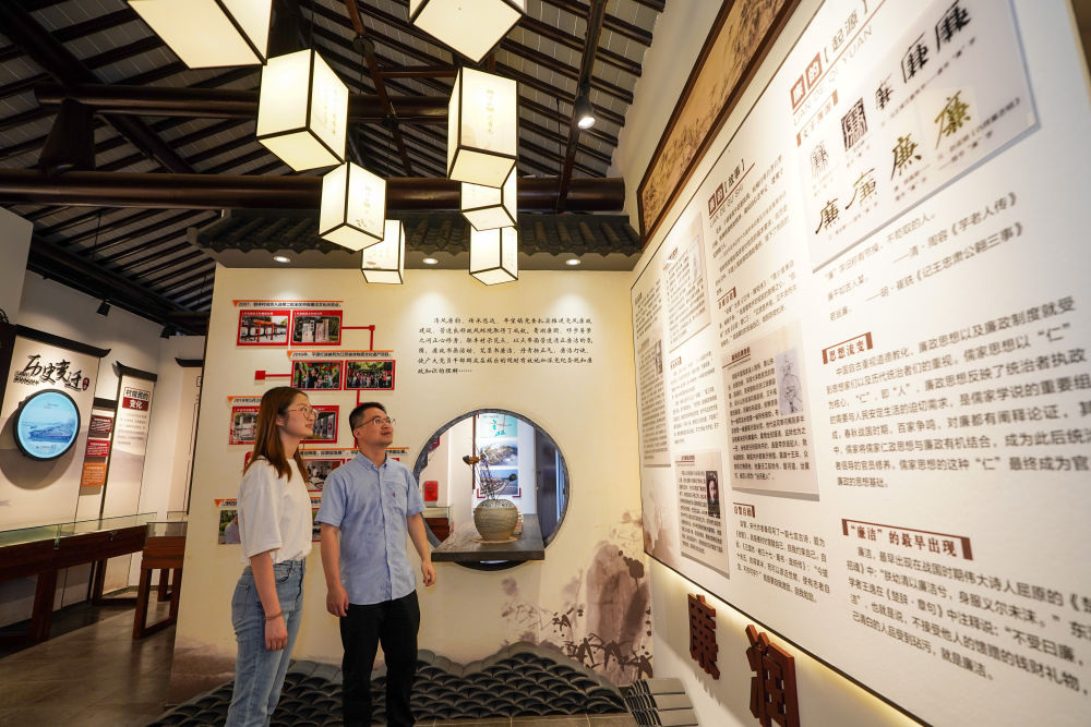 2024年7月4日,参观者在苏州市吴江区平望镇廉洁教育基地莺湖廉园内参观。新华社记者李博摄